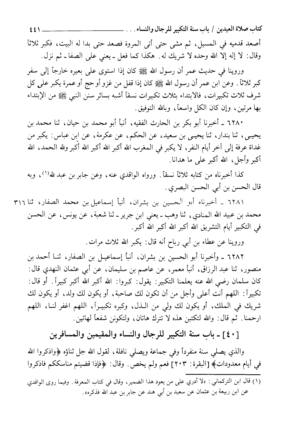 6280 - أَخْبَرَنَا أَبُو بَكْرِ بْنُ الْحَارِثِ الْفَقِيهُ، أنبأ أَبُو مُحَمَّدِ بْنُ حَيَّانَ، ثنا مُحَمَّدُ بْنُ يَحْيَى، ثنا بُنْدَارٌ، ثنا يَحْيَى بْنُ سَعِيدٍ، عَنِ الْحَكَمِ، عَنْ عِكْرِمَةَ، عَنِ ابْنِ عَبَّاسٍ: §" يُكَبِّرُ مِنْ غَدَاةِ عَرَفَةَ إِلَى آخِرِ أَيَّامِ النَّفْرِ، لَا يُكَبِّرُ فِي الْمَغْرِبِ: اللهُ أَكْبَرُ , اللهُ أَكْبَرُ , اللهُ أَكْبَرُ , وَلِلَّهِ الْحَمْدُ , اللهُ أَكْبَرُ وَأَجَلُّ، اللهُ أَكْبَرُ عَلَى مَا هَدَانَا ". كَذَا أَخْبَرَنَاهُ مِنْ كِتَابِهِ ثَلَاثًا نَسَقًا , وَرَوَاهُ الْوَاقِدِيُّ عَنْهُ وَعَنْ جَابِرِ بْنِ عَبْدِ اللهِ , وَبِهِ قَالَ الْحَسَنُ بْنُ أَبِي الْحَسَنِ الْبَصْرِيُّ