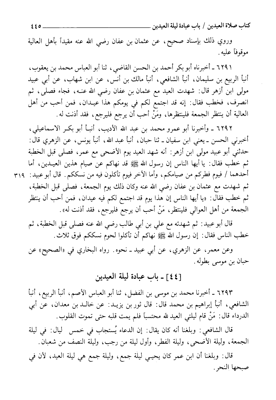 6291 - أَخْبَرَنَاهُ أَبُو بَكْرٍ أَحْمَدُ بْنُ الْحَسَنِ الْقَاضِي , ثنا أَبُو الْعَبَّاسِ مُحَمَّدُ بْنُ يَعْقُوبَ , أنبأ الرَّبِيعُ بْنُ سُلَيْمَانَ، أنبأ الشَّافِعِيُّ، أنبأ مَالِكُ بْنُ أَنَسٍ، عَنِ ابْنِ شِهَابٍ، عَنْ أَبِي عُبَيْدٍ مَوْلَى ابْنِ أَزْهَرَ قَالَ: شَهِدْتُ الْعِيدَ مَعَ عُثْمَانَ بْنِ عَفَّانَ رَضِيَ اللهُ عَنْهُ فَجَاءَ فَصَلَّى ثُمَّ انْصَرَفَ فَخَطَبَ، فَقَالَ: " إِنَّهُ قَدْ §اجْتَمَعَ لَكُمْ فِي يَوْمِكُمْ هَذَا عِيدَانِ، فَمَنْ أَحَبَّ مِنْ أَهْلِ الْعَالِيَةِ أَنْ يَنْتَظِرَ الْجُمُعَةَ فَلْيَنْتَظِرْهَا , مَنْ أَحَبَّ أَنْ يَرْجِعَ فَلْيَرْجِعْ فَقَدْ أَذِنْتُ لَهُ "