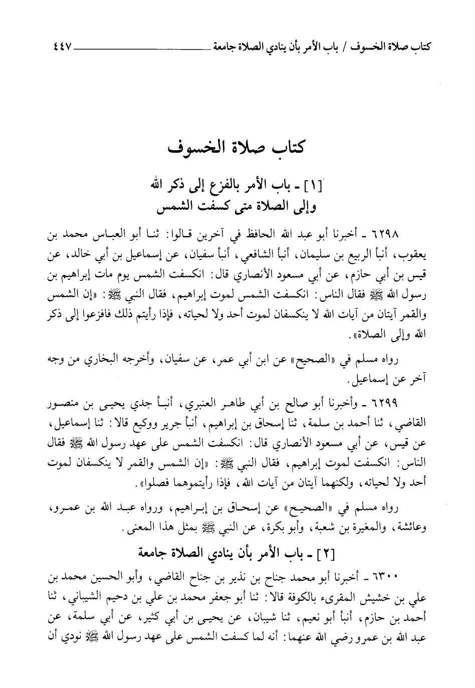 6300 - أَخْبَرَنَا أَبُو مُحَمَّدٍ جَنَاحُ بْنُ نُذَيْرِ بْنِ جَنَاحٍ الْقَاضِي وَأَبُو الْحُسَيْنِ مُحَمَّدُ بْنُ عَلِيِّ بْنِ حُبَيْشٍ الْمُقْرِئُ بِالْكُوفَةِ , قَالَا: ثنا أَبُو جَعْفَرٍ مُحَمَّدُ بْنُ عَلِيِّ بْنِ دُحَيْمٍ الشَّيْبَانِيُّ , ثنا أَحْمَدُ بْنُ حَازِمٍ، أنبأ أَبُو نُعَيْمٍ، ثنا شَيْبَانُ، عَنْ يَحْيَى بْنِ أَبِي كَثِيرٍ، عَنْ أَبِي سَلَمَةَ، عَنْ عَبْدِ اللهِ بْنِ عَمْرٍو رَضِيَ اللهُ عَنْهُمْا: " أَنَّهُ §لَمَّا كَسَفَتِ الشَّمْسُ عَلَى عَهْدِ رَسُولِ اللهِ صَلَّى اللهُ عَلَيْهِ وَسَلَّمَ نُودِيَ أَنَّ -[448]- الصَّلَاةَ جَامِعَةٌ , فَرَكَعَ رَسُولُ اللهِ صَلَّى اللهُ عَلَيْهِ وَسَلَّمَ رَكْعَتَيْنِ فِي سَجْدَةٍ، ثُمَّ قَامَ فَرَكَعَ رَكْعَتَيْنِ فِي سَجْدَةٍ، ثُمَّ جَلَسَ حَتَّى جُلِّيَ عَنِ الشَّمْسِ ". رَوَاهُ الْبُخَارِيُّ فِي الصَّحِيحِ عَنْ أَبِي نُعَيْمٍ، وَأَخْرَجَهُ مُسْلِمٌ مِنْ وَجْهٍ آخَرَ عَنْ شَيْبَانَ