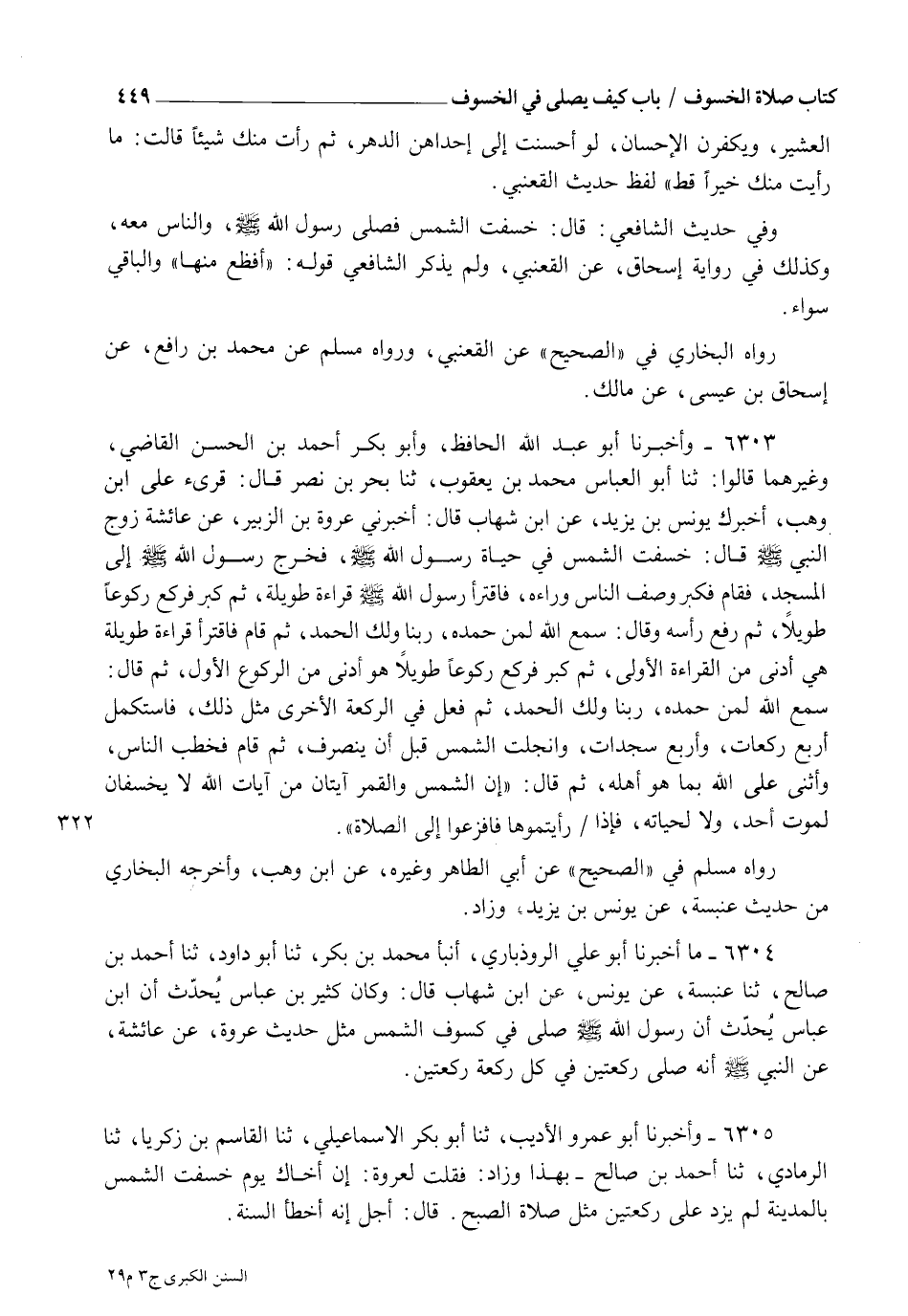 6304 - مَا أَخْبَرَنَا أَبُو عَلِيٍّ الرُّوذْبَارِيُّ، أنبأ مُحَمَّدُ بْنُ بَكْرٍ، ثنا أَبُو دَاوُدَ، ثنا أَحْمَدُ بْنُ صَالِحٍ، ثنا عَنْبَسَةُ، عَنْ يُونُسَ، عَنِ ابْنِ شِهَابٍ قَالَ: وَكَانَ كَثِيرُ بْنُ عَبَّاسٍ يُحَدِّثُ، أَنَّ ابْنَ عَبَّاسٍ يُحَدِّثُ، أَنَّ رَسُولَ اللهِ صَلَّى اللهُ عَلَيْهِ وَسَلَّمَ صَلَّى فِي كُسُوفِ الشَّمْسِ مِثْلَ حَدِيثِ عُرْوَةَ عَنْ عَائِشَةَ عَنِ النَّبِيِّ صَلَّى اللهُ عَلَيْهِ وَسَلَّمَ أَنَّهُ صَلَّى رَكْعَتَيْنِ فِي كُلِّ رَكْعَةٍ رَكْعَتَيْنِ.