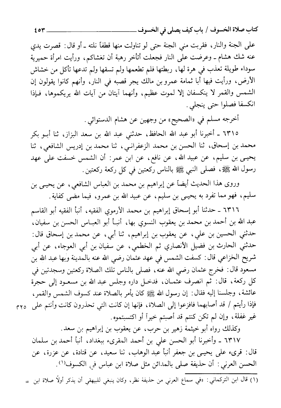 6316 - حَدَّثَنَا أَبُو إِسْحَاقَ إِبْرَاهِيمُ بْنُ مُحَمَّدٍ الْأَرْمَوِيُّ الْفَقِيهُ، أنبأ الْفَقِيهُ أَبُو الْقَاسِمِ عَبْدُ اللهِ بْنُ أَحْمَدَ بْنِ مُحَمَّدِ بْنِ يَعْقُوبَ النَّسَوِيُّ بِهَا، أنبأ أَبُو الْعَبَّاسِ الْحَسَنُ بْنُ سُفْيَانَ، حَدَّثَنِي الْحُسَيْنُ بْنُ عَلِيٍّ، عَنْ يَعْقُوبَ بْنِ إِبْرَاهِيمَ، ثنا أَبِي، عَنْ مُحَمَّدِ بْنِ إِسْحَاقَ قَالَ: حَدَّثَنِي الْحَارِثُ بْنُ فُضَيْلٍ الْأَنْصَارِيُّ، ثُمَّ الْخَطْمِيُّ، عَنْ سُفْيَانَ بْنِ أَبِي الْعَوْجَاءِ، عَنْ أَبِي شُرَيْحٍ الْخُزَاعِيِّ قَالَ: " كَسَفَتِ الشَّمْسُ فِي عَهْدِ عُثْمَانَ رَضِيَ اللهُ عَنْهُ بِالْمَدِينَةِ وَبِهَا عَبْدُ اللهِ بْنُ مَسْعُودٍ قَالَ: " فَخَرَجَ عُثْمَانُ رَضِيَ اللهُ عَنْهُ فَصَلَّى بِالنَّاسِ تِلْكَ الصَّلَاةَ رَكْعَتَيْنِ وَسَجْدَتَيْنِ فِي كُلِّ رَكْعَةٍ، قَالَ: ثُمَّ انْصَرَفَ عُثْمَانُ فَدَخَلَ دَارَهُ، وَجَلَسَ عَبْدُ اللهِ بْنُ مَسْعُودٍ إِلَى حُجْرَةِ عَائِشَةَ وَجَلَسْنَا إِلَيْهِ، فَقَالَ: " إِنَّ رَسُولَ اللهِ صَلَّى اللهُ عَلَيْهِ وَسَلَّمَ §كَانَ يَأْمُرُ بِالصَّلَاةِ عِنْدَ كُسُوفِ الشَّمْسِ وَالْقَمَرِ، فَإِذَا رَأَيْتُمْ قَدْ أَصَابَهُمَا فَافْزَعُوا إِلَى الصَّلَاةِ، فَإِنَّهَا إِنْ كَانَتِ الَّتِي تَحْذَرُونَ كَانَتْ وَأَنْتُمْ عَلَى غَيْرِ غَفْلَةٍ، وَإِنْ لَمْ تَكُنْ كُنْتُمْ قَدْ أَصَبْتُمْ خَيْرًا أَوِ اكْتَسَبْتُمُوهُ ". وَكَذَلِكَ رَوَاهُ أَبُو خَيْثَمَةَ زُهَيْرُ بْنُ حَرْبٍ عَنْ يَعْقُوبَ بْنِ إِبْرَاهِيمَ بْنِ سَعْدٍ