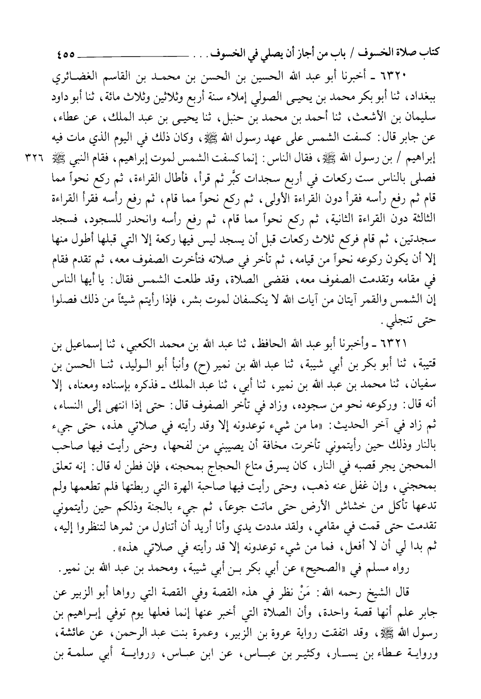 6321 - وَأَخْبَرَنَا أَبُو عَبْدِ اللهِ الْحَافِظُ، ثنا عَبْدُ اللهِ بْنُ مُحَمَّدٍ الْكَعْبِيُّ، ثنا إِسْمَاعِيلُ بْنُ قُتَيْبَةَ، ثنا أَبُو بَكْرِ بْنُ أَبِي شَيْبَةَ، ثنا عَبْدُ اللهِ بْنُ نُمَيْرٍ،. ح وَأنبأ أَبُو الْوَلِيدِ، ثنا الْحَسَنُ بْنُ سُفْيَانَ، ثنا مُحَمَّدُ بْنُ عَبْدِ اللهِ بْنِ نُمَيْرٍ، ثنا أَبِي، ثنا عَبْدُ الْمَلِكِ، فَذَكَرَهُ بِإِسْنَادِهِ وَمَعْنَاهُ إِلَّا أَنَّهُ قَالَ: وَرُكُوعُهُ نَحْوٌ مِنْ سُجُودِهِ وَزَادَ فِي تَأَخُّرِ الصُّفُوفِ قَالَ: حَتَّى إِذَا انْتَهَى إِلَى النِّسَاءِ، ثُمَّ زَادَ فِي آخِرِ الْحَدِيثِ: " §مَا مِنْ شَيْءٍ تُوعَدُونَهُ إِلَّا وَقَدْ رَأَيْتُهُ فِي صَلَاتِي هَذِهِ حَتَّى جِيءَ بِالنَّارِ وَذَلِكَ حِينَ رَأَيْتُمُونِي تَأَخَّرْتُ مَخَافَةَ أَنْ يُصِيبَنِي مِنْ لَفْحِهَا، وَحَتَّى رَأَيْتُ فِيهَا صَاحِبَ الْمِحْجَنِ يَجُرُّ قُصْبَهُ فِي النَّارِ، كَانَ يَسْرِقُ مَتَاعَ الْحُجَّاجِ بِمِحْجَنِهِ، فَإِنْ فُطِنَ لَهُ قَالَ إِنَّهُ تَعَلَّقَ بِمِحْجَنِي، وَإِنْ غُفِلَ عَنْهُ ذَهَبَ، وَحَتَّى رَأَيْتُ فِيهَا صَاحِبَةَ الْهِرَّةِ الَّتِي رَبَطَتْهَا فَلَمْ تُطْعِمْهَا وَلَمْ تَدَعْهَا تَأْكُلُ مِنْ خَشَاشِ الْأَرْضِ حَتَّى مَاتَتْ جُوعًا، ثُمَّ جِيءَ بِالْجَنَّةِ، وَذَلِكُمْ حِينَ رَأَيْتُمُونِي تَقَدَّمْتُ حَتَّى قُمْتُ فِي مَقَامِي، وَلَقَدْ مَدَدْتُ يَدِي وَأَنَا أُرِيدُ أَنْ أَتَنَاوَلَ مِنْ ثَمَرِهَا لِتَنْظُرُوا إِلَيْهِ، ثُمَّ بَدَا لِي أَنْ لَا أَفْعَلَ، فَمَا مِنْ شَيْءٍ تُوعَدُونَهُ إِلَّا قَدْ رَأَيْتُهُ فِي صَلَاتِي هَذِهِ". رَوَاهُ مُسْلِمٌ فِي الصَّحِيحِ عَنْ أَبِي بَكْرِ بْنِ أَبِي شَيْبَةَ، وَمُحَمَّدِ بْنِ عَبْدِ اللهِ بْنِ نُمَيْرٍ. قَالَ الشَّيْخُ رَحِمَهُ اللهُ: مَنْ نَظَرَ فِي هَذِهِ الْقِصَّةِ وَفِي الْقِصَّةِ الَّتِي رَوَاهَا أَبُو الزُّبَيْرِ عَنْ جَابِرٍ عَلِمَ أَنَّهَا قِصَّةٌ وَاحِدَةٌ، وَأَنَّ الصَّلَاةَ الَّتِي أَخْبَرَ عَنْهَا إِنَّمَا فَعَلَهَا يَوْمَ تُوُفِّيَ إِبْرَاهِيمُ ابْنُ رَسُولِ اللهِ صَلَّى اللهُ عَلَيْهِ وَسَلَّمَ، وَقَدِ اتَّفَقَتْ رِوَايَةُ عُرْوَةَ بْنِ الزُّبَيْرِ وَعَمْرَةَ بِنْتِ عَبْدِ الرَّحْمَنِ عَنْ عَائِشَةَ، وَرِوَايَةُ عَطَاءِ بْنِ يَسَارٍ وَكَثِيرِ بْنِ عَبَّاسٍ، عَنِ ابْنِ عَبَّاسٍ، وَرِوَايَةُ أَبِي سَلَمَةَ بْنِ -[456]- عَبْدِ الرَّحْمَنِ عَنْ عَبْدِ اللهِ بْنِ عَمْرٍو، وَرِوَايَةُ أَبِي الزُّبَيْرِ عَنْ جَابِرِ بْنِ عَبْدِ اللهِ عَنِ النَّبِيِّ صَلَّى اللهُ عَلَيْهِ وَسَلَّمَ: " إِنَّمَا صَلَّاهَا رَكْعَتَيْنِ فِي كُلِّ رَكْعَةٍ رُكُوعَيْنِ"، وَفِي حِكَايَةِ أَكْثَرِهِمْ قَوْلُهُ صَلَّى اللهُ عَلَيْهِ وَسَلَّمَ يَوْمَئِذٍ: " إِنَّ الشَّمْسَ وَالْقَمَرَ آيَتَانِ مِنْ آيَاتِ اللهِ، لَا تَنْخَسِفَانِ لِمَوْتِ أَحَدٍ وَلَا لِحَيَاتِهِ" دَلَالَةً عَلَى أَنَّهُ إِنَّمَا صَلَّاهَا يَوْمَ تُوُفِّيَ ابْنُهُ، فَخَطَبَ وَقَالَ هَذِهِ الْمَقَالَةَ رَدًّا لِقَوْلِهِمْ: إِنَّمَا كَسَفَتْ لِمَوْتِهِ، وَفِي اتِّفَاقِ هَؤُلَاءِ الْعَدَدِ مَعَ فَضْلِ حِفْظِهِمْ دَلَالَةٌ عَلَى أَنَّهُ لَمْ يَزِدْ فِي كُلِّ رَكْعَةٍ عَلَى رُكُوعَيْنِ، كَمَا ذَهَبَ إِلَيْهِ الشَّافِعِيُّ وَمُحَمَّدُ بْنُ إِسْمَاعِيلَ الْبُخَارِيُّ رَحِمَهُمَا اللهُ تَعَالَى