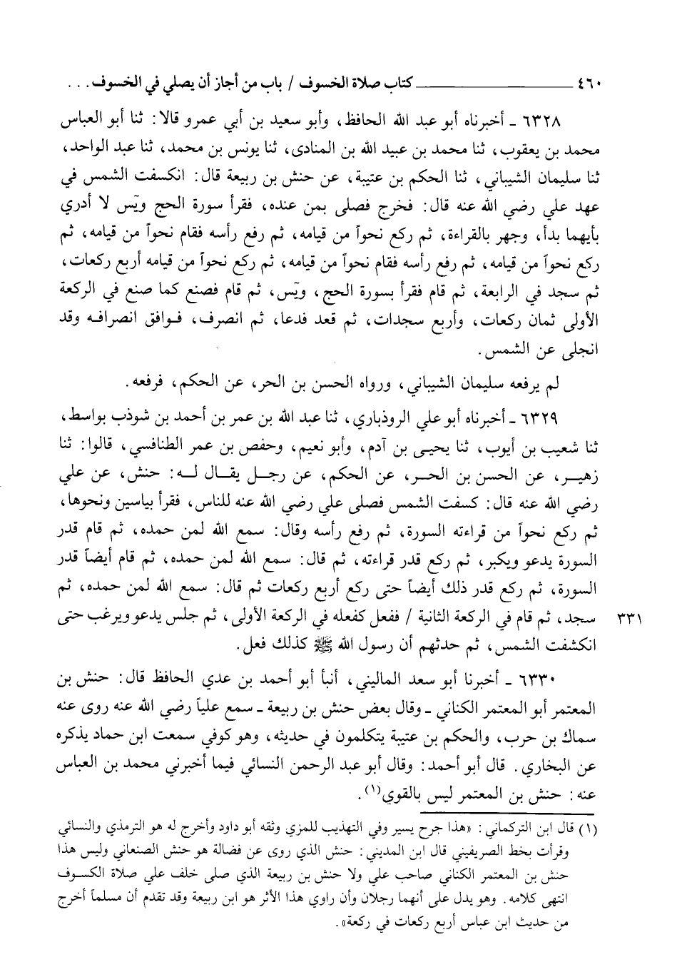 6330 - أَخْبَرَنَا أَبُو سَعْدٍ الْمَالِينِيُّ، أَنْبَأَ أَبُو أَحْمَدَ بْنُ عَدِيٍّ الْحَافِظُ، قَالَ: حَنَشُ بْنُ الْمُعْتَمِرِ أَبُو الْمُعْتَمِرِ الْكِنَانِيُّ وَقَالَ بَعْضُهُمْ: حَنَشُ بْنُ رَبِيعَةَ سَمِعَ عَلِيًّا رَضِيَ اللهُ عَنْهُ، رَوَى عَنْهُ سِمَاكُ بْنُ حَرْبٍ، وَالْحَكَمُ بْنُ عُتَيْبَةَ، يَتَكَلَّمُونَ فِي حَدِيثِهِ، وَهُوَ كُوفِيٌّ، سَمِعْتُ ابْنَ حَمَّادٍ يَذْكُرُهُ عَنِ الْبُخَارِيِّ، قَالَ أَبُو أَحْمَدَ وَقَالَ أَبُو عَبْدِ الرَّحْمَنِ النَّسَائِيُّ فِيمَا أَخْبَرَنِي مُحَمَّدُ بْنُ الْعَبَّاسِ عَنْهُ: حَنَشُ بْنُ الْمُعْتَمِرِ لَيْسَ بِالْقَوِيِّ. -[461]- قَالَ الشَّيْخُ: وَمِنْ أَصْحَابِنَا مَنْ ذَهَبَ إِلَى تَصْحِيحِ الْأَخْبَارِ الْوَارِدَةِ فِي هَذِهِ الْأَعْدَادِ، وَأَنَّ النَّبِيَّ صَلَّى اللهُ عَلَيْهِ وَسَلَّمَ فَعَلَهَا مَرَّاتٍ مَرَّةً رُكُوعَيْنِ فِي كُلِّ رَكْعَةٍ، وَمَرَّةً ثَلَاثَ رُكُوعَاتٍ فِي كُلِّ رَكْعَةٍ، وَمَرَّةً أَرْبَعَ رُكُوعَاتٍ فِي كُلِّ رَكْعَةٍ، فَأَدَّى كُلٌّ مِنْهُمْ مَا حَفِظَ وَأَنَّ الْجَمِيعَ جَائِزٌ وَكَأَنَّهُ صَلَّى اللهُ عَلَيْهِ وَسَلَّمَ كَانَ يَزِيدُ فِي الرُّكُوعِ إِذَا لَمْ يَرَ الشَّمْسَ قَدْ تَجَلَّتْ ذَهَبَ إِلَى هَذَا إِسْحَاقُ بْنُ رَاهَوَيْهِ، وَمَنْ بَعْدَهُ مُحَمَّدُ بْنُ إِسْحَاقَ بْنِ خُزَيْمَةَ، وَأَبُو بَكْرٍ أَحْمَدُ بْنُ إِسْحَاقَ بْنِ أَيُّوبَ الصِّبْغِيُّ، وَأَبُو سُلَيْمَانَ الْخَطَّابِيُّ، وَاسْتَحْسَنَهُ أَبُو بَكْرٍ مُحَمَّدُ بْنُ إِبْرَاهِيمَ بْنِ الْمُنْذِرِ صَاحِبُ الْخِلَافِيَّاتِ، وَبِاللهِ التَّوْفِيقُ، وَالَّذِي أَشَارَ إِلَيْهِ الشَّافِعِيُّ مِنَ التَّرْجِيحِ أَصَحُّ، وَاللهُ أَعْلَمُ
