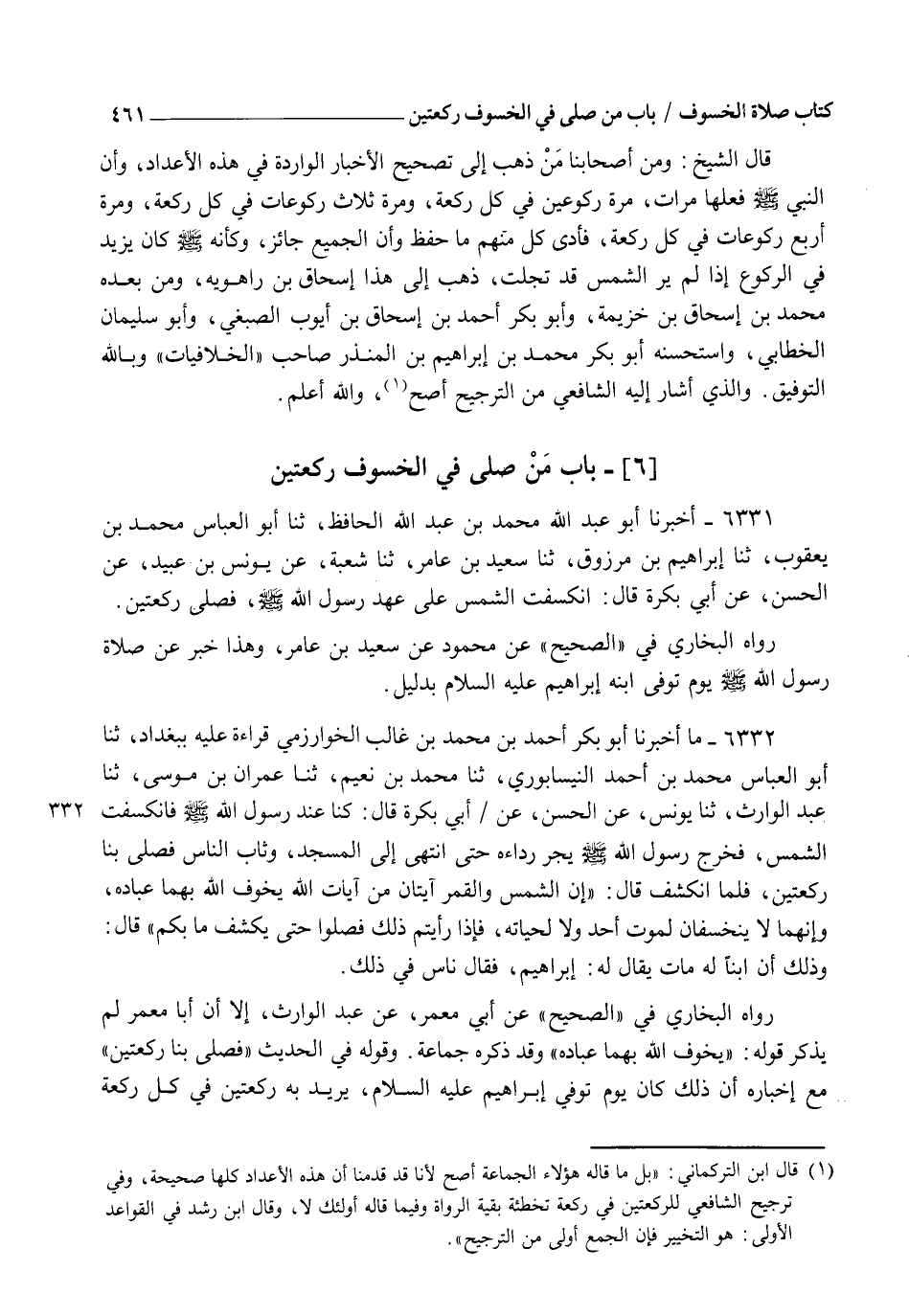 6331 - أَخْبَرَنَا أَبُو عَبْدِ اللهِ مُحَمَّدُ بْنُ عَبْدِ اللهِ الْحَافِظُ، ثنا أَبُو الْعَبَّاسِ مُحَمَّدُ بْنُ يَعْقُوبَ، ثنا إِبْرَاهِيمُ بْنُ مَرْزُوقٍ، ثنا سَعِيدُ بْنُ عَامِرٍ، ثنا شُعْبَةُ، عَنْ يُونُسَ بْنِ عُبَيْدِ، عَنِ الْحَسَنِ، عَنْ أَبِي بَكَرَةَ قَالَ: §" انْكَسَفَتِ الشَّمْسُ عَلَى عَهْدِ رَسُولِ اللهِ صَلَّى اللهُ عَلَيْهِ وَسَلَّمَ فَصَلَّى رَكْعَتَيْنِ ". رَوَاهُ الْبُخَارِيُّ فِي الصَّحِيحِ عَنْ مَحْمُودٍ عَنْ سَعِيدِ بْنِ عَامِرٍ. وَهَذَا خَبَرٌ عَنْ صَلَاةِ رَسُولِ اللهِ صَلَّى اللهُ عَلَيْهِ وَسَلَّمَ يَوْمَ تُوُفِّيَ ابْنُهُ إِبْرَاهِيمُ عَلَيْهِ السَّلَامُ بِدَلِيلِ