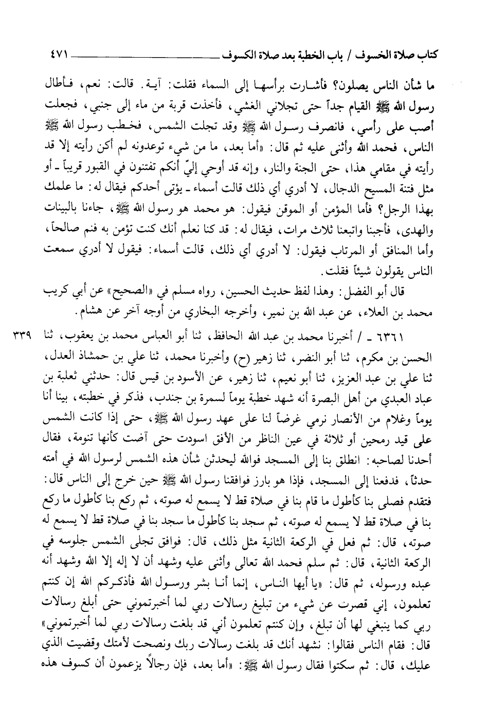 6361 - أَخْبَرَنَا مُحَمَّدُ بْنُ عَبْدِ اللهِ الْحَافِظُ، ثنا أَبُو الْعَبَّاسِ مُحَمَّدُ بْنُ يَعْقُوبَ، ثنا الْحَسَنُ بْنُ مُكْرَمٍ، ثنا أَبُو النَّضْرِ، ثنا زُهَيْرٌ، ح وَأَخْبَرَنَا مُحَمَّدٌ، ثنا عَلِيُّ بْنُ حَمْشَاذٍ الْعَدْلُ، ثنا عَلِيُّ بْنُ عَبْدِ الْعَزِيزِ، ثنا أَبُو نُعَيْمٍ، ثنا زُهَيْرٌ، عَنِ الْأَسْوَدِ بْنِ قَيْسٍ قَالَ: حَدَّثَنِي ثَعْلَبَةُ بْنُ عِبَادٍ الْعَبْدِيُّ مِنْ أَهْلِ الْبَصْرَةِ، أَنَّهُ شَهِدَ خُطْبَةً يَوْمًا لِسَمُرَةَ بْنِ جُنْدُبٍ فَذَكَرَ فِي خُطْبَتِهِ: " بَيْنَا أَنَا يَوْمًا وَغُلَامٌ مِنَ الْأَنْصَارِ نَرْمِي غَرَضًا لَنَا عَلَى عَهْدِ رَسُولِ اللهِ صَلَّى اللهُ عَلَيْهِ وَسَلَّمَ، حَتَّى إِذَا كَانَتِ الشَّمْسُ عَلَى قِيدِ رُمْحَيْنِ أَوْ ثَلَاثَةٍ فِي عَيْنِ النَّاظِرِ مِنَ الْأُفُقِ، اسْوَدَّتْ حَتَّى آضَتْ كَأَنَّهَا تَنُّومَةٌ، فَقَالَ أَحَدُنَا لِصَاحِبِهِ: انْطَلِقْ بِنَا إِلَى الْمَسْجِدِ، فَوَاللهِ لَيُحْدِثَنَّ شَأْنُ هَذِهِ الشَّمْسِ لِرَسُولِ اللهِ صَلَّى اللهُ عَلَيْهِ وَسَلَّمَ فِي أُمَّتِهِ حَدَثًا. فَدَفَعْنَا إِلَى الْمَسْجِدِ، فَإِذَا هُوَ بَارِزٌ، فَوَافَقْنَا رَسُولَ اللهِ صَلَّى اللهُ عَلَيْهِ وَسَلَّمَ حِينَ خَرَجَ إِلَى النَّاسِ، قَالَ: فَتَقَدَّمَ فَصَلَّى بِنَا كَأَطْوَلِ مَا قَامَ بِنَا فِي صَلَاةٍ قَطُّ، لَا يُسْمَعُ لَهُ صَوْتُهُ، ثُمَّ رَكَعَ بِنَا كَأَطْوَلِ مَا رَكَعَ بِنَا فِي صَلَاةٍ قَطُّ، لَا يُسْمَعُ لَهُ صَوْتُهُ، ثُمَّ سَجَدَ بِنَا كَأَطْوَلِ مَا سَجَدَ بِنَا فِي صَلَاةٍ قَطُّ، لَا يُسْمَعُ لَهُ صَوْتُهُ، قَالَ: ثُمَّ فَعَلَ فِي الرَّكْعَةِ الثَّانِيَةِ مِثْلَ ذَلِكَ، قَالَ: فَوَافَقَ تَجَلِّي الشَّمْسِ جُلُوسَهُ فِي الرَّكْعَةِ الثَّانِيَةِ، قَالَ: ثُمَّ سَلَّمَ، فَحَمِدَ اللهَ تَعَالَى، وَأَثْنَى عَلَيْهِ، وَشَهِدَ أَنْ لَا إِلَهَ إِلَّا اللهُ، وَأَشْهَدُ أَنَّهُ عَبْدُهُ وَرَسُولُهُ، ثُمَّ قَالَ: " يَا أَيُّهَا النَّاسُ، إِنَّمَا أَنَا بَشَرٌ وَرَسُولُ اللهِ، فَأُذَكِّرُكُمُ اللهَ إِنْ كُنْتُمْ تَعْلَمُونَ أَنِّي قَصَّرْتُ عَنْ شَيْءٍ مِنْ تَبْلِيغِ رِسَالِاتِ رَبِّي لَمَا أَخْبَرْتُمُونِي حَتَّى أُبَلِّغَ رِسَالِاتِ رَبِّي كَمَا يَنْبَغِي لَهَا أَنْ تُبَلَّغَ، وَإِنْ كُنْتُمْ تَعْلَمُونَ أَنِّي قَدْ بَلَّغْتُ رِسَالِاتِ رَبِّي لَمَا أَخْبَرْتُمُونِي " قَالَ: فَقَامَ النَّاسُ فَقَالُوا: نَشْهَدُ أَنَّكَ قَدْ بَلَّغْتَ رِسَالِاتِ رَبِّكَ، وَنَصَحْتَ لِأُمَّتِكَ، وَقَضَيْتَ الَّذِي عَلَيْكَ. قَالَ: ثُمَّ سَكَتُوا، فَقَالَ رَسُولُ اللهِ صَلَّى اللهُ عَلَيْهِ وَسَلَّمَ: " أَمَّا بَعْدُ، فَإِنَّ رِجَالًا يَزْعُمُونَ أَنَّ كُسُوفَ هَذِهِ -[472]- الشَّمْسِ، وَكُسُوفَ هَذَا الْقَمَرِ، وَزَوَالَ هَذِهِ النُّجُومِ عَنْ مَطَالِعِهَا لِمَوْتِ رِجَالٍ عُظَمَاءَ مِنْ أَهْلِ الْأَرْضِ، وَأَنَّهُمْ كَذَبُوا، وَلَكِنْ آيَاتٌ مِنْ آيَاتِ اللهِ يَفْتِنُ بِهَا عِبَادَهُ لَيَنْظُرَ مَنْ يُحْدِثُ مِنْهُمْ تَوْبَةً، وَاللهِ لَقَدْ رَأَيْتُ مُنْذُ قُمْتُ أُصَلِّي مَا أَنْتُمْ لَاقُونَ فِي دُنْيَاكُمْ وَأُخْرَاكُمْ، وَإِنَّهُ وَاللهِ §لَا تَقُومُ السَّاعَةُ حَتَّى يَخْرُجَ ثَلَاثُونَ كَذَّابًا، آخِرُهُمُ الْأَعْوَرُ الدَّجَّالُ مَمْسُوحُ الْعَيْنِ الْيُسْرَى كَأَنَّهَا عَيْنُ أَبِي يَحْيَى لِشَيْخٍ مِنَ الْأَنْصَارِ، وَإِنَّهُ مَتَى خَرَجَ فَإِنَّهُ يَزْعُمُ أَنَّهُ اللهُ، فَمَنْ آمَنَ بِهِ وَصَدَّقَهُ وَاتَّبَعَهُ فَلَيْسَ يَنْفَعُهُ صَالِحٌ مِنْ عَمَلٍ سَالِفٍ، وَمَنْ كَفَرَ بِهِ وَكَذَّبَهُ فَلَيْسَ يُعَاقَبُ بِشَيْءٍ مِنْ عَمَلِهِ سَلَفَ، وَإِنَّهُ سَيَظْهَرُ عَلَى الْأَرْضِ كُلِّهَا إِلَّا ال