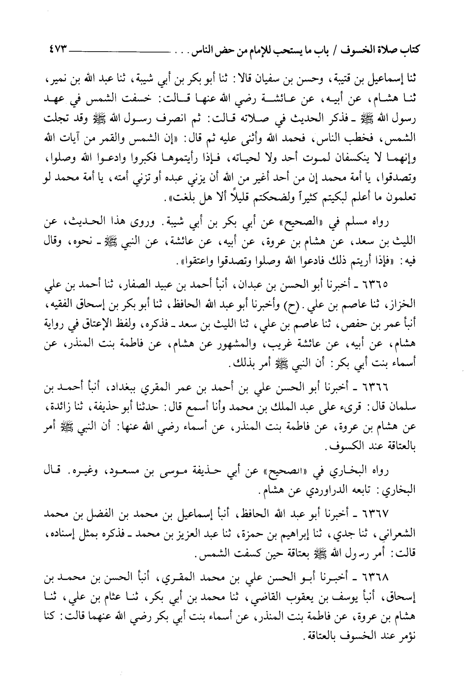 6367 - أَخْبَرَنَا أَبُو عَبْدِ اللهِ الْحَافِظُ، أنبأ إِسْمَاعِيلُ بْنُ مُحَمَّدِ بْنِ الْفَضْلِ بْنِ مُحَمَّدٍ الشَّعْرَانِيُّ، ثنا جَدِّي، ثنا إِبْرَاهِيمُ بْنُ حَمْزَةَ، ثنا عَبْدُ الْعَزِيزِ بْنُ مُحَمَّدٍ، فَذَكَرَهُ بِمِثْلِ إِسْنَادِهِ، قَالَتْ: §" أَمَرَ رَسُولُ اللهِ صَلَّى اللهُ عَلَيْهِ وَسَلَّمَ بِعَتَاقَةٍ حِينَ كَسَفَتِ الشَّمْسُ "