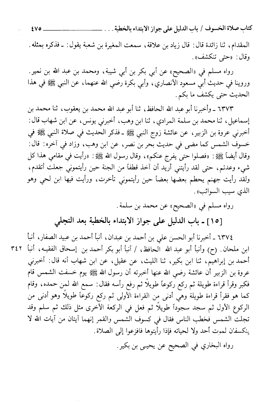 6374 - أَخْبَرَنَا أَبُو الْحَسَنِ عَلِيُّ بْنُ أَحْمَدَ بْنِ عَبْدَانَ، أنبأ أَحْمَدُ بْنُ عُبَيْدٍ الصَّفَّارُ، أنبأ ابْنُ مِلْحَانَ، ح وَأنبأ أَبُو عَبْدِ اللهِ الْحَافِظُ، أنبأ أَبُو بَكْرٍ أَحْمَدُ بْنُ إِسْحَاقَ الْفَقِيهُ، أنبأ أَحْمَدُ بْنُ إِبْرَاهِيمَ، ثنا ابْنُ بُكَيْرٍ، ثنا اللَّيْثُ، عَنْ عُقَيْلٍ، عَنِ ابْنِ شِهَابٍ أَنَّهُ قَالَ: أَخْبَرَنِي عُرْوَةُ بْنُ الزُّبَيْرِ، أَنَّ عَائِشَةَ رَضِيَ اللهُ عَنْهَا أَخْبَرَتْهُ: " أَنَّ رَسُولَ اللهِ صَلَّى اللهُ عَلَيْهِ وَسَلَّمَ يَوْمَ خَسَفَتِ الشَّمْسُ قَامَ فَكَبَّرَ وَقَرَأَ قِرَاءَةً طَوِيلَةً، ثُمَّ رَكَعَ رُكُوعًا طَوِيلًا، ثُمَّ رَفَعَ رَأْسَهُ فَقَالَ: " سَمِعَ اللهُ لِمَنْ حَمِدَهُ " وَقَامَ كَمَا هُوَ فَقَرَأَ قِرَاءَةً طَوِيلَةً، وَهِيَ أَدْنَى مِنَ الْقِرَاءَةِ الْأُولَى، ثُمَّ رَكَعَ رُكُوعًا طَوِيلًا، وَهُوَ أَدْنَى مِنَ الرُّكُوعِ الْأَوَّلِ، ثُمَّ سَجَدَ سُجُودًا طَوِيلًا، ثُمَّ فَعَلَ فِي الرَّكْعَةِ الْأُخْرَى مِثْلَ ذَلِكَ، ثُمَّ سَلَّمَ وَقَدْ تَجَلَّتِ الشَّمْسُ، فَخَطَبَ النَّاسَ، فَقَالَ فِي كُسُوفِ الشَّمْسِ وَالْقَمَرِ: " إِنَّهُمَا §آيَتَانِ مِنْ آيَاتِ اللهِ، لَا يَنْكَسِفَانِ لِمَوْتِ أَحَدٍ وَلَا لِحَيَاتِهِ، فَإِذَا رَأَيْتُمُوهُمَا فَافْزَعُوا إِلَى الصَّلَاةِ ". رَوَاهُ الْبُخَارِيُّ فِي الصَّحِيحِ عَنْ يَحْيَى بْنِ بُكَيْرٍ