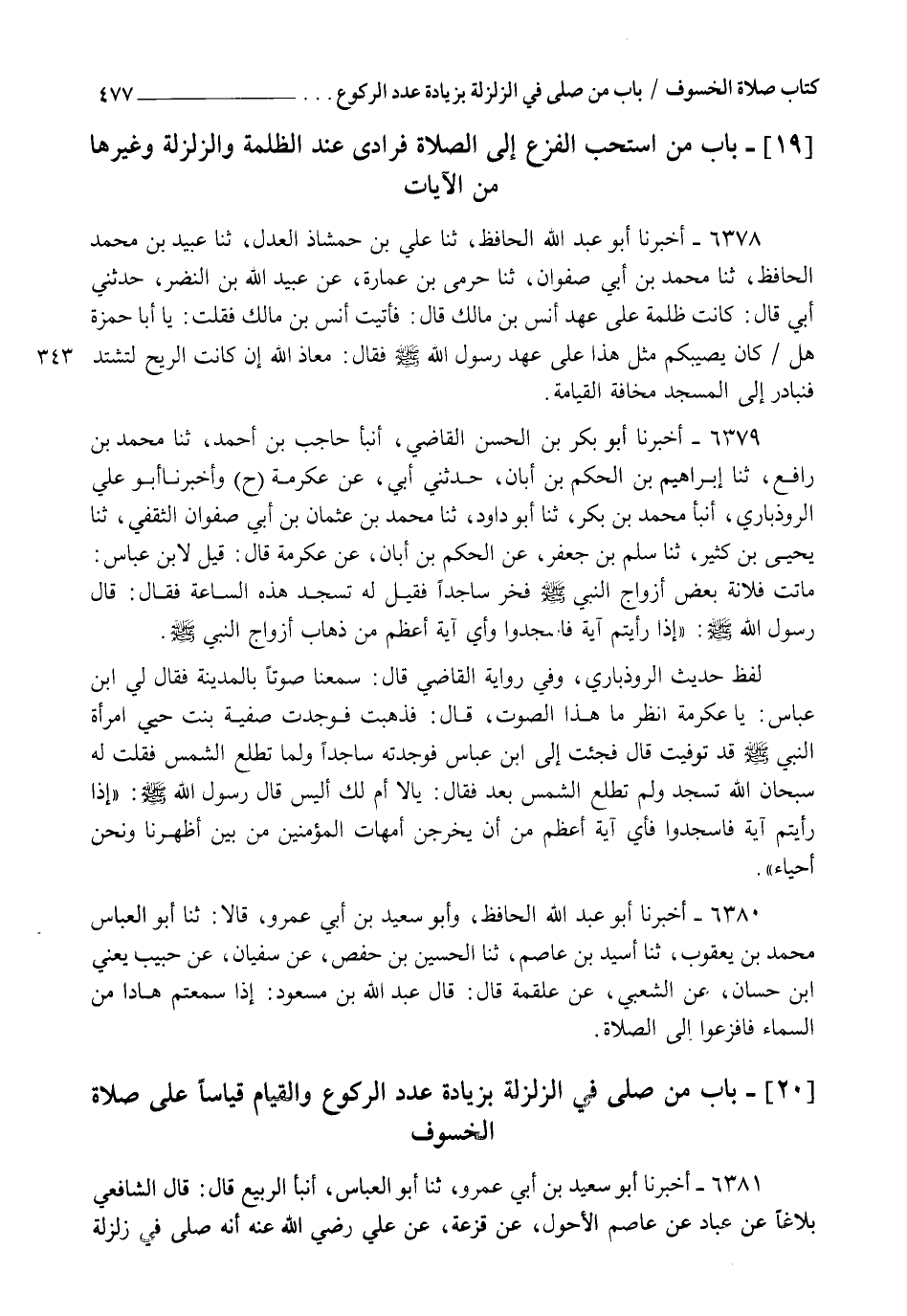 6379 - أَخْبَرَنَا أَبُو بَكْرِ بْنُ الْحَسَنِ الْقَاضِي، أنبأ حَاجِبُ بْنُ أَحْمَدَ، ثنا مُحَمَّدُ بْنُ رَافِعٍ، ثنا إِبْرَاهِيمُ بْنُ الْحَكَمِ بْنِ أَبَانَ، حَدَّثَنِي أَبِي، عَنْ عِكْرِمَةَ، ح وَأَخْبَرَنَا أَبُو عَلِيٍّ الرُّوذْبَارِيُّ، أنبأ مُحَمَّدُ بْنُ بَكْرٍ، ثنا أَبُو دَاوُدَ، ثنا مُحَمَّدُ بْنُ عُثْمَانَ بْنِ أَبِي صَفْوَانَ الثَّقَفِيُّ، ثنا يَحْيَى بْنُ كَثِيرٍ، ثنا سَلَمُ بْنُ جَعْفَرٍ، عَنِ الْحَكَمِ بْنِ أَبَانَ، عَنْ عِكْرِمَةَ قَالَ: " قِيلَ لِابْنِ عَبَّاسٍ: مَاتَتْ فُلَانَةُ، بَعْضُ أَزْوَاجِ النَّبِيِّ صَلَّى اللهُ عَلَيْهِ وَسَلَّمَ، فَخَرَّ سَاجِدًا، فَقِيلَ لَهُ: تَسْجُدُ هَذِهِ السَّاعَةَ؟ فَقَالَ: قَالَ رَسُولُ اللهِ صَلَّى اللهُ عَلَيْهِ وَسَلَّمَ: §" إِذَا رَأَيْتُمْ آيَةً فَاسْجُدُوا " وَأِيُّ آيَةٍ أَعْظَمُ مِنْ ذِهَابِ أَزْوَاجِ النَّبِيِّ صَلَّى اللهُ عَلَيْهِ وَسَلَّمَ ". لَفْظُ حَدِيثِ الرُّوذْبَارِيِّ