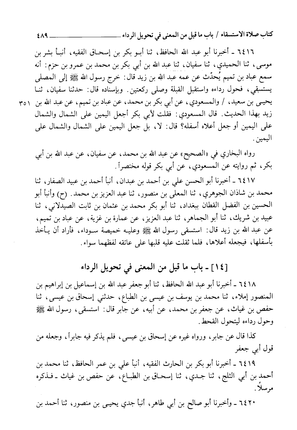 6416 - أَخْبَرَنَا أَبُو عَبْدِ اللهِ الْحَافِظُ، ثنا أَبُو بَكْرِ بْنُ إِسْحَاقَ الْفَقِيهُ، أنبأ بِشْرُ بْنُ مُوسَى، ثنا الْحُمَيْدِيُّ، ثنا سُفْيَانُ، ثنا عَبْدُ اللهِ بْنُ أَبِي بَكْرِ بْنِ مُحَمَّدِ بْنِ عَمْرِو بْنِ حَزْمٍ أَنَّهُ سَمِعَ عَبَّادَ بْنَ تَمِيمٍ يُحَدِّثُ، عَنْ عَمِّهِ عَبْدِ اللهِ بْنِ زَيْدٍ قَالَ: §" خَرَجَ رَسُولُ اللهِ صَلَّى اللهُ عَلَيْهِ وَسَلَّمَ إِلَى الْمُصَلَّى يَسْتَسْقِي، فَحَوَّلَ رِدَاءَهُ، وَاسْتَقْبَلَ الْقِبْلَةَ، وَصَلَّى رَكْعَتَيْنِ ". وَبِإِسْنَادِهِ قَالَ: حَدَّثَنَا سُفْيَانُ، ثنا يَحْيَى بْنُ سَعِيدٍ، وَالْمَسْعُودِيُّ، عَنْ أَبِي بَكْرِ بْنِ مُحَمَّدٍ، عَنْ عَبَّادِ بْنِ تَمِيمٍ، عَنْ عَبْدِ اللهِ بْنِ زَيْدٍ بِهَذَا الْحَدِيثِ. قَالَ الْمَسْعُودِيُّ: فَقُلْتُ لِأَبِي بَكْرٍ: " أَجَعَلَ الْيَمِينَ عَلَى الشِّمَالِ وَالشِّمَالَ عَلَى الْيَمِينِ، أَوْ جَعَلَ أَعْلَاهُ أَسْفَلَهُ، قَالَ: لَا، بَلْ جَعَلَ الْيَمِينَ عَلَى الشِّمَالِ وَالشِّمَالَ عَلَى الْيَمِينِ. رَوَاهُ الْبُخَارِيُّ فِي الصَّحِيحِ عَنْ عَبْدِ اللهِ بْنِ مُحَمَّدٍ عَنْ سُفْيَانَ عَنْ عَبْدِ اللهِ بْنِ أَبِي بَكْرٍ، ثُمَّ رِوَايَتُهُ عَنِ الْمَسْعُودِيِّ عَنْ أَبِي بَكْرٍ قَوْلُهُ مُخْتَصَرًا
