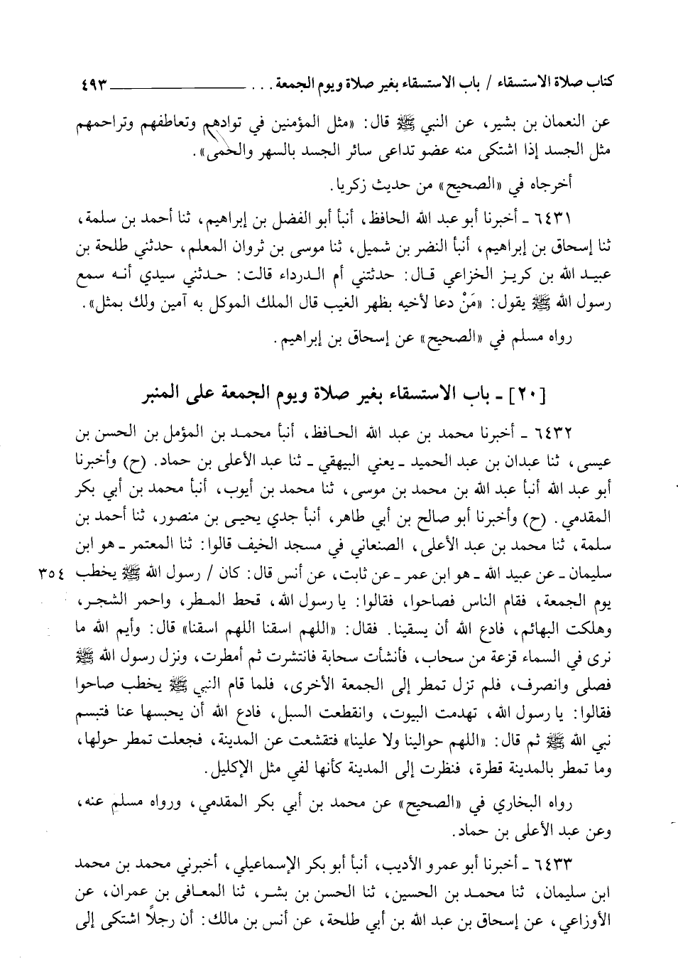 6433 - أَخْبَرَنَا أَبُو عَمْرٍو الْأَدِيبُ، أنبأ أَبُو بَكْرٍ الْإِسْمَاعِيلِيُّ، أَخْبَرَنِي مُحَمَّدُ بْنُ مُحَمَّدِ بْنِ سُلَيْمَانَ، ثنا مُحَمَّدُ بْنُ الْحُسَيْنِ، ثنا الْحَسَنُ بْنُ بِشْرٍ، ثنا الْمُعَافَى بْنُ عِمْرَانَ، عَنِ الْأَوْزَاعِيِّ، عَنْ إِسْحَاقَ بْنِ عَبْدِ اللهِ بْنِ أَبِي طَلْحَةَ، عَنْ أَنَسِ بْنِ مَالِكٍ: " أَنَّ رَجُلًا اشْتَكَى إِلَى -[494]- رَسُولُ اللهِ صَلَّى اللهُ عَلَيْهِ وَسَلَّمَ هَلَاكَ الْمَالِ، وَجَهْدَ الْعِيَالِ؛ قَالَ: §فَدَعَا اللهَ فَسُقِيَ، وَلَمْ يَذْكُرْ أَنَّهُ حَوَّلَ رِدَاءَهُ، وَلَا اسْتَقْبَلَ الْقِبْلَةَ ". رَوَاهُ الْبُخَارِيُّ فِي الصَّحِيحِ، عَنِ الْحَسَنِ بْنِ بِشْرَانَ، وَفِيهِ مَعَ مَا مَضَى مِنْ حَدِيثِ عَبْدِ اللهِ بْنِ زَيْدٍ، كَالدِّلَالَةِ عَلَى أَنَّ ذَلِكَ إِنَّمَا يُسَنُّ فِي خُطْبَةِ الِاسْتِسْقَاءِ دُونَ خُطْبَةِ الْجُمُعَةِ، وَاللهُ أَعْلَمُ
