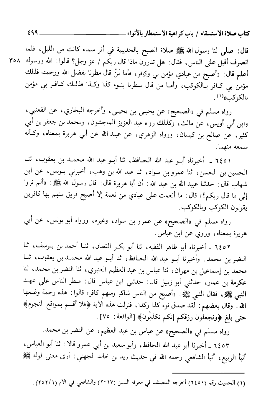 6452 - أَخْبَرَنَاهُ أَبُو طَاهِرٍ الْفَقِيهُ، ثنا أَبُو بَكْرٍ الْقَطَّانُ، ثنا أَحْمَدُ بْنُ يُوسُفَ، ثنا النَّضْرُ بْنُ مُحَمَّدٍ، وَأَخْبَرَنَا أَبُو عَبْدِ اللهِ الْحَافِظُ، ثنا أَبُو عَبْدِ اللهِ مُحَمَّدُ بْنُ يَعْقُوبَ، ثنا مُحَمَّدُ بْنُ إِسْمَاعِيلَ بْنِ مِهْرَانَ، ثنا عَبَّاسُ بْنُ عَبْدِ الْعَظِيمِ الْعَنْبَرِيُّ، ثنا النَّضْرُ بْنُ مُحَمَّدٍ، ثنا عِكْرِمَةُ بْنُ عَمَّارٍ، حَدَّثَنِي أَبُو زُمَيْلٍ، قَالَ: حَدَّثَنِي ابْنُ عَبَّاسٍ قَالَ: مُطِرَ النَّاسُ عَلَى عَهْدِ النَّبِيِّ صَلَّى اللهُ عَلَيْهِ وَسَلَّمَ، فَقَالَ النَّبِيُّ صَلَّى اللهُ عَلَيْهِ وَسَلَّمَ: " §أَصْبَحَ مِنَ النَّاسِ شَاكِرٌ، وَمِنْهُمْ كَافِرٌ، قَالُوا: هَذِهِ رَحْمَةٌ وَضَعَهَا اللهُ، وَقَالَ بَعْضُهُمْ: لَقَدْ صَدَقَ نَوْءُ كَذَا وَكَذَا فَنَزَلَتْ هَذِهِ الْآيَةُ {فَلَا أُقْسِمُ بِمَوَاقِعِ النُّجُومِ} [الواقعة: 75] حَتَّى بَلَغَ {وَتَجْعَلُونَ رِزْقَكُمْ أَنَّكُمْ تُكَذِّبُونَ} [الواقعة: 82] ". رَوَاهُ مُسْلِمٌ فِي الصَّحِيحِ عَنْ عَبَّاسِ بْنِ عَبْدِ الْعَظِيمِ، عَنِ النَّضْرِ بْنِ مُحَمَّدٍ