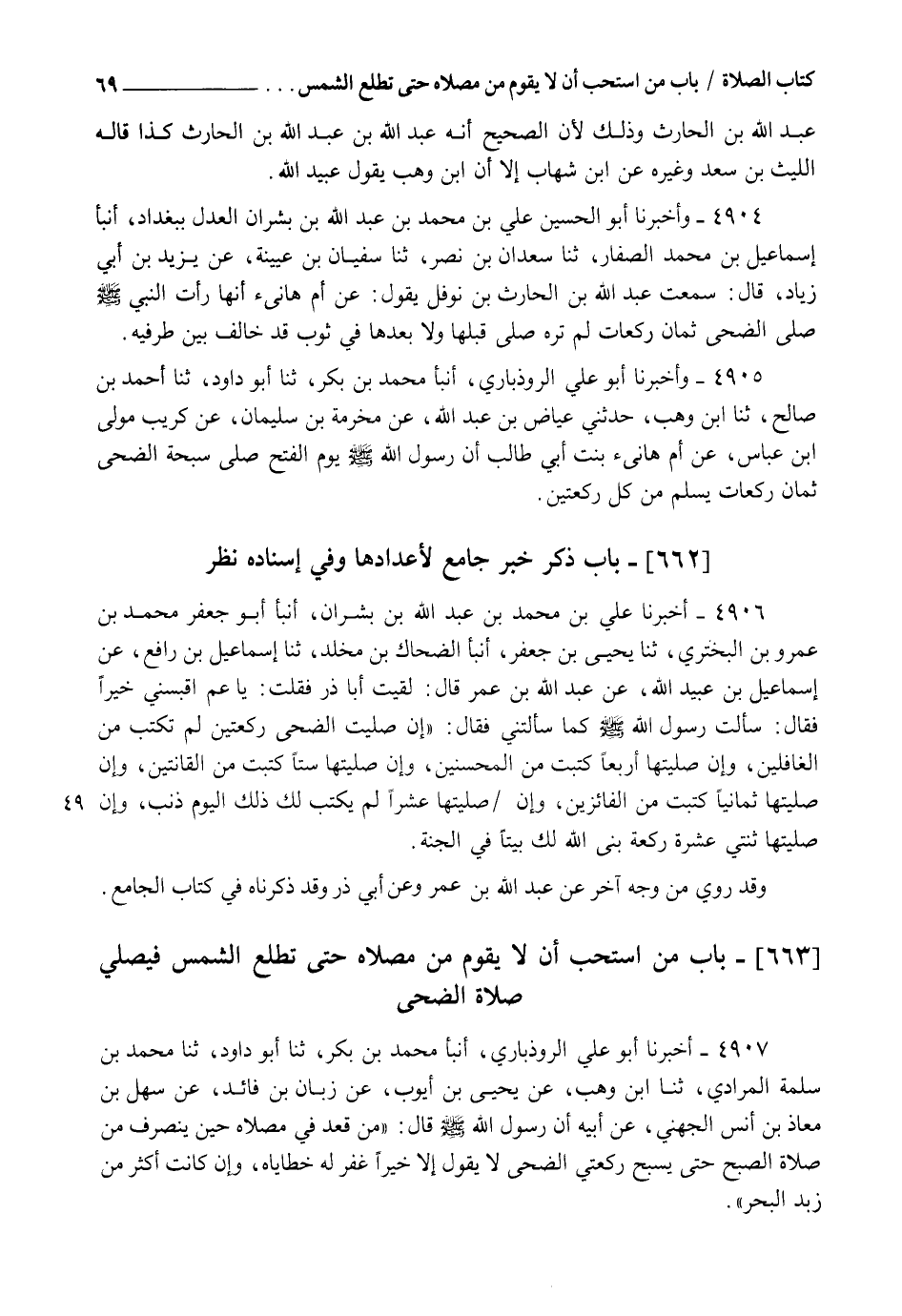 4904 - وَأَخْبَرَنَا أَبُو الْحُسَيْنِ عَلِيُّ بْنُ مُحَمَّدِ بْنِ عَبْدِ اللهِ بْنِ بِشْرَانَ الْعَدْلُ بِبَغْدَادَ، أنبأ إِسْمَاعِيلُ بْنُ مُحَمَّدٍ الصَّفَّارُ، ثنا سَعْدَانُ بْنُ نَصْرٍ، ثنا سُفْيَانُ بْنُ عُيَيْنَةَ، عَنْ يَزِيدَ بْنِ أَبِي زِيَادٍ قَالَ: سَمِعْتُ عَبْدَ اللهِ بْنَ الْحَارِثِ بْنِ نَوْفَلٍ يَقُولُ عَنْ أُمِّ هَانِئٍ " أَنَّهَا رَأَتِ النَّبِيَّ صَلَّى اللهُ عَلَيْهِ وَسَلَّمَ §صَلَّى الضُّحَى ثَمَانِ رَكَعَاتٍ، لَمْ تَرَهُ صَلَّى قَبْلَهَا وَلَا بَعْدَهَا، فِي ثَوْبٍ قَدْ خَالَفَ بَيْنَ طَرَفَيْهِ "