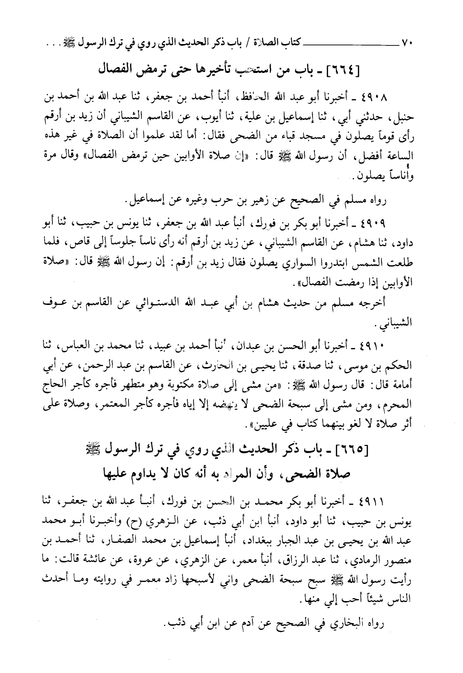 4908 - أَخْبَرَنَا أَبُو عَبْدِ اللهِ الْحَافِظُ، أنبأ أَحْمَدُ بْنُ جَعْفَرٍ، ثنا عَبْدُ اللهِ بْنُ أَحْمَدَ بْنِ حَنْبَلٍ، حَدَّثَنِي أَبِي، ثنا إِسْمَاعِيلُ بْنُ عُلَيَّةَ، ثنا أَيُّوبُ، عَنِ الْقَاسِمِ الشَّيْبَانِيِّ، أَنَّ زَيْدَ بْنَ أَرْقَمَ رَأَى قَوْمًا يُصَلُّونَ فِي مَسْجِدِ قُبَاءٍ مِنَ الضُّحَى فَقَالَ: " أَمَا لَقَدْ عَلِمُوا أَنَّ الصَّلَاةَ فِي غَيْرِ هَذِهِ السَّاعَةِ أَفْضَلُ، إِنَّ رَسُولَ اللهِ صَلَّى اللهُ عَلَيْهِ وَسَلَّمَ قَالَ: " إِنَّ §صَلَاةَ الْأَوَّابِينَ حِينَ تَرْمَضُ الْفِصَالُ ". وَقَالَ مَرَّةً وَأُنَاسًا يُصَلُّونَ. رَوَاهُ مُسْلِمٌ فِي الصَّحِيحِ عَنْ زُهَيْرِ بْنِ حَرْبٍ وَغَيْرِهِ عَنْ إِسْمَاعِيلَ