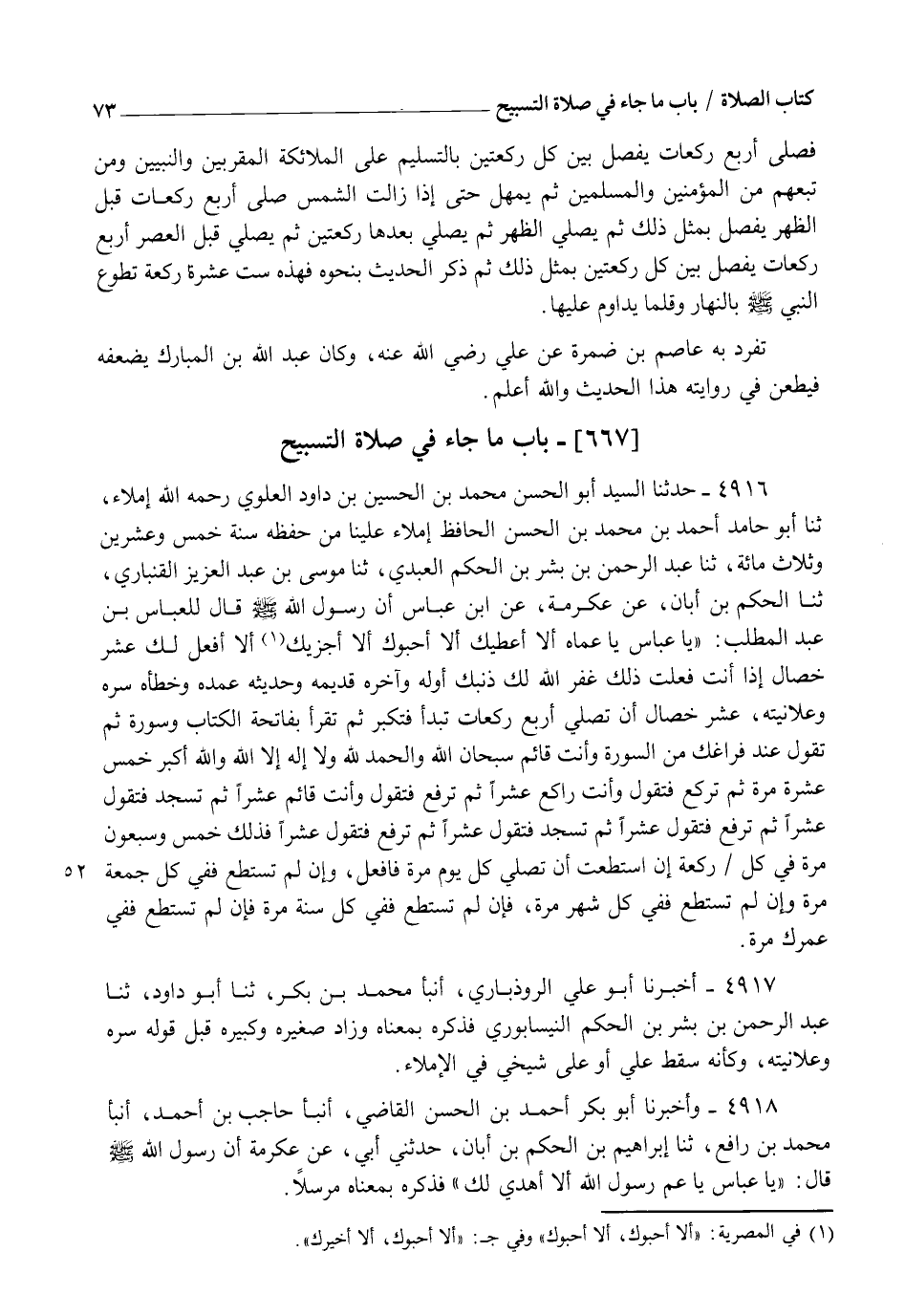 4916 - حَدَّثَنَا السَّيِّدُ أَبُو الْحَسَنِ مُحَمَّدُ بْنُ الْحُسَيْنِ بْنِ دَاوُدَ الْعَلَوِيُّ رَحِمَهُ اللهُ إِمْلَاءً، ثنا أَبُو حَامِدٍ أَحْمَدُ بْنُ مُحَمَّدِ بْنِ الْحَسَنِ الْحَافِظُ إِمْلَاءً عَلَيْنَا مِنْ حِفْظِهِ سَنَةَ خَمْسٍ وَعِشْرِينَ وَثَلَاثِمِائَةٍ، ثنا عَبْدُ الرَّحْمَنِ بْنُ بِشْرِ بْنِ الْحَكَمِ الْعَبْدِيُّ، ثنا مُوسَى بْنُ عَبْدِ الْعَزِيزِ الْقِنْبَارِيُّ، ثنا الْحَكَمُ بْنُ أَبَانَ، عَنْ عِكْرِمَةَ، عَنِ ابْنِ عَبَّاسٍ " أَنَّ رَسُولَ اللهِ صَلَّى اللهُ عَلَيْهِ وَسَلَّمَ قَالَ لِلْعَبَّاسِ بْنِ عَبْدِ الْمُطَّلِبِ: " يَا عَبَّاسُ، يَا عَمَّاهُ، §أَلَا أُعْطِيكَ، أَلَا أَحْبُوكَ، أَلَا أَجْزِيكَ، أَلَا أَفْعَلُ لَكَ عَشْرَ خِصَالٍ، إِذَا أَنْتَ فَعَلْتَ ذَلِكَ غَفَرَ اللهُ لَكَ ذَنْبَكَ أَوَّلَهُ وَآخِرَهُ، قَدِيمَهُ وَحَدِيثَهُ، عَمْدَهُ وَخَطَأَهُ، سِرَّهُ وَعَلَانِيَتَهُ، عَشْرُ خِصَالٍ، أَنْ تُصَلَّيَ أَرْبَعَ رَكَعَاتٍ، تَبْدَأُ فَتُكَبِّرُ، ثُمَّ تَقْرَأُ بِفَاتِحَةِ الْكِتَابِ وَسُورَةٍ، ثُمَّ تَقُولُ عِنْدَ فَرَاغِكَ مِنَ السُّورَةِ وَأَنْتَ قَائِمٌ: سُبْحَانَ اللهِ وَالْحَمْدُ لِلَّهِ وَلَا إِلَهَ إِلَّا اللهُ وَاللهُ أَكْبَرُ خَمْسَ عَشْرَةَ مَرَّةً، ثُمَّ تَرْكَعُ فَتَقُولُ وَأَنْتَ رَاكِعٌ عَشْرًا، ثُمَّ تَرْفَعُ فَتَقُولُ وَأَنْتَ قَائِمٌ عَشْرًا، ثُمَّ تَسْجُدُ فَتَقُولُ عَشْرًا، ثُمَّ تَرْفَعُ فَتَقُولُ عَشْرًا، ثُمَّ تَسْجُدُ فَتَقُولُ عَشْرًا، ثُمَّ تَرْفَعُ فَتَقُولُ عَشْرًا، فَذَلِكَ خَمْسٌ وَسَبْعُونَ مَرَّةً فِي كُلِّ رَكْعَةٍ، إِنِ اسْتَطَعْتَ أَنْ تُصَلِّيَ كُلَّ يَوْمٍ مَرَّةً فَافْعَلْ، وَإِنْ لَمْ تَسْتَطِعْ فَفِي كُلِّ جُمُعَةٍ مَرَّةً، وَإِنْ لَمْ تَسْتَطِعْ فَفِي كُلِّ شَهْرٍ مَرَّةً، فَإِنْ لَمْ تَسْتَطِعْ فَفِي كُلِّ سَنَةٍ مَرَّةً، فَإِنْ لَمْ تَسْتَطِعْ فَفِي عُمُرِكَ مَرَّةً ".