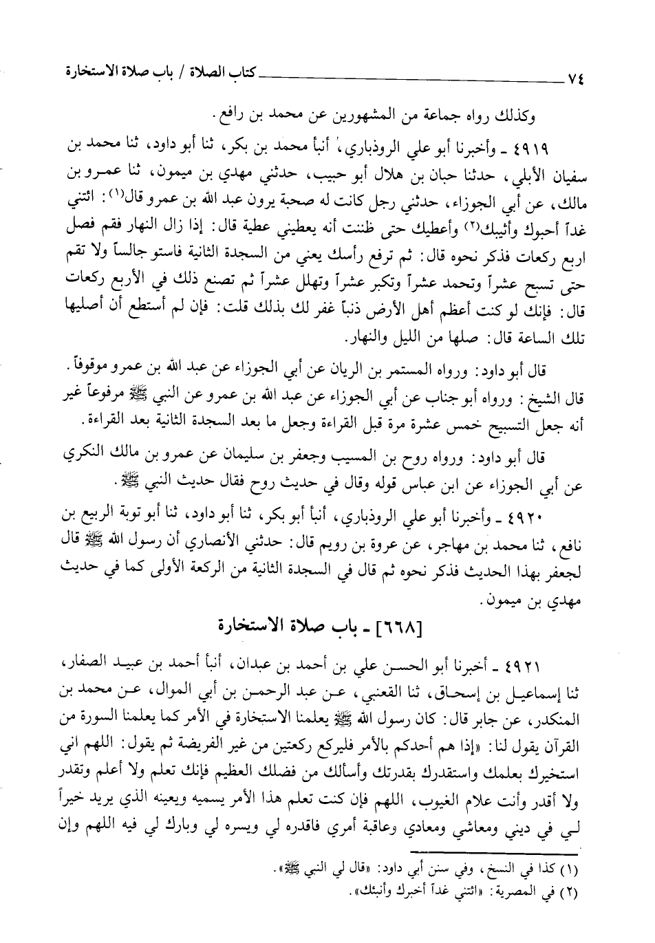 4919 - وَأَخْبَرَنَا أَبُو عَلِيٍّ الرُّوذْبَارِيُّ، أنبأ مُحَمَّدُ بْنُ بَكْرٍ، ثنا أَبُو دَاوُدَ، ثنا مُحَمَّدُ بْنُ سُفْيَانَ الْأُبُلِّيُّ، حَدَّثَنَا حَبَّانُ بْنُ هِلَالٍ أَبُو حَبِيبٍ، حَدَّثَنِي مَهْدِيُّ بْنُ مَيْمُونٍ، ثنا عَمْرُو بْنُ مَالِكٍ، عَنْ أَبَى الْجَوْزَاءِ، حَدَّثَنِي رَجُلٌ كَانَتْ لَهُ صُحْبَةٌ يَرَوْنَ، عَبْدَ اللهِ بْنَ عَمْرٍو قَالَ: " ائْتِنِي غَدًا أَحْبُوكَ وَأُثِيبُكَ وَأُعْطِيكَ "، حَتَّى ظَنَنْتُ أَنَّهُ يُعْطِينِي عَطِيَّةً قَالَ: " §إِذَا زَالَ النَّهَارُ فَقُمْ فَصَلِّ أَرْبَعَ رَكَعَاتٍ "، فَذَكَرَ نَحْوَهُ. قَالَ: " ثُمَّ تَرْفَعُ رَأْسَكَ، يَعْنِي مِنَ السَّجْدَةِ الثَّانِيَةِ، فَاسْتَوِ جَالِسًا وَلَا تَقُمْ حَتَّى تُسَبِّحَ عَشْرًا، وَتَحْمَدَ عَشْرًا، وَتُكَبِّرَ عَشْرًا، وَتُهَلِّلَ عَشْرًا، ثُمَّ تَصْنَعُ ذَلِكَ فِي الْأَرْبَعِ رَكَعَاتٍ ". قَالَ: " فَإِنَّكَ لَوْ كُنْتَ أَعْظَمَ أَهْلِ الْأَرْضِ ذَنْبًا غُفِرَ لَكَ بِذَلِكَ "، قُلْتُ: فَإِنْ لَمْ أَسْتَطِعْ أَنْ أُصَلِّيَهَا تِلْكَ السَّاعَةَ؟ قَالَ: " صَلِّهَا مِنَ اللَّيْلِ وَالنَّهَارِ ". قَالَ أَبُو دَاوُدَ: وَرَوَاهُ الْمُسْتَمِرُّ بْنُ الرَّيَّانِ، عَنْ أَبَى الْجَوْزَاءِ، عَنْ عَبْدِ اللهِ بْنِ عَمْرٍو مَوْقُوفًا. قَالَ الشَّيْخُ: وَرَوَاهُ أَبُو جَنَابٍ عَنْ أَبَى الْجَوْزَاءِ، عَنْ عَبْدِ اللهِ بْنِ عَمْرٍو عَنِ النَّبِيِّ صَلَّى اللهُ عَلَيْهِ وَسَلَّمَ مَرْفُوعًا. غَيْرَ أَنَّهُ جَعَلَ التَّسْبِيحَ خَمْسَ عَشْرَةَ مَرَّةً قَبْلَ الْقِرَاءَةِ، وَجَعَلَ مَا بَعْدَ السَّجْدَةِ الثَّانِيَةِ بَعْدَ الْقِرَاءَةِ، قَالَ أَبُو دَاوُدَ: وَرَوَاهُ رَوْحُ بْنُ الْمُسَيَّبِ، وَجَعْفَرُ بْنُ سُلَيْمَانَ، عَنْ عَمْرِو بْنِ مَالِكٍ النُّكْرِيِّ، عَنْ أَبَى الْجَوْزَاءِ، عَنِ ابْنِ عَبَّاسٍ قَوْلَهُ، وَقَالَ فِي حَدِيثِ رَوْحٍ: فَقَالَ حَدِيثَ النَّبِيِّ صَلَّى اللهُ عَلَيْهِ وَسَلَّمَ.