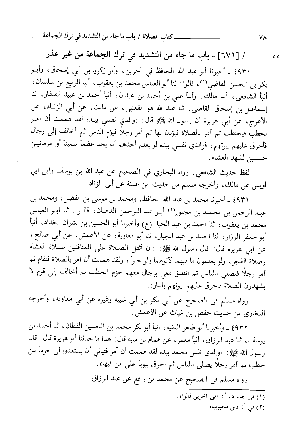 4931 - أَخْبَرَنَا مُحَمَّدُ بْنُ عَبْدِ اللهِ الْحَافِظُ، وَمُحَمَّدُ بْنُ مُوسَى بْنِ الْفَضْلِ، وَمُحَمَّدُ بْنُ عَبْدِ الرَّحْمَنِ بْنِ مُحَمَّدِ بْنِ مَجْبُورٍ أَبُو عَبْدِ الرَّحْمَنِ الدَّهَّانُ قَالُوا: ثنا أَبُو الْعَبَّاسِ مُحَمَّدُ بْنُ يَعْقُوبَ، ثنا أَحْمَدُ بْنُ عَبْدِ الْجَبَّارِ، ح وَأَخْبَرَنَا أَبُو الْحُسَيْنِ بْنُ بِشْرَانَ بِبَغْدَادَ، أنبأ أَبُو جَعْفَرٍ الرَّزَّازُ، ثنا أَحْمَدُ بْنُ عَبْدِ الْجَبَّارِ، ثنا أَبُو مُعَاوِيَةَ، عَنِ الْأَعْمَشِ، عَنْ أَبِي صَالِحٍ، عَنْ أَبِي هُرَيْرَةَ قَالَ: قَالَ رَسُولُ اللهِ صَلَّى اللهُ عَلَيْهِ وَسَلَّمَ: " إِنَّ §أَثْقَلَ الصَّلَاةِ عَلَى الْمُنَافِقِينَ صَلَاةُ الْعِشَاءِ وَصَلَاةُ الْفَجْرِ، وَلَوْ يَعْلَمُونَ مَا فِيهِمَا لَأَتَوْهُمَا وَلَوْ حَبْوًا، وَلَقَدْ هَمَمْتُ أَنْ آمُرَ بِالصَّلَاةِ فَتُقَامَ، ثُمَّ آمُرَ رَجُلًا فَيُصَلِّي بِالنَّاسِ، ثُمَّ أَنْطَلِقَ مَعِي بِرِجَالٍ مَعَهُمْ حُزَمُ الْحَطَبِ، ثُمَّ أُخَالِفَ إِلَى قَوْمٍ لَا يَشْهَدُونَ الصَّلَاةَ فَأُحَرِّقَ عَلَيْهِمْ بُيُوتَهُمْ بِالنَّارِ ". رَوَاهُ مُسْلِمٌ فِي الصَّحِيحِ عَنْ أَبِي بَكْرِ بْنِ أَبِي شَيْبَةَ وَغَيْرِهِ عَنْ أَبِي مُعَاوِيَةَ، وَأَخْرَجَهُ الْبُخَارِيُّ مِنْ حَدِيثِ حَفْصِ بْنِ غِيَاثٍ عَنِ الْأَعْمَشِ