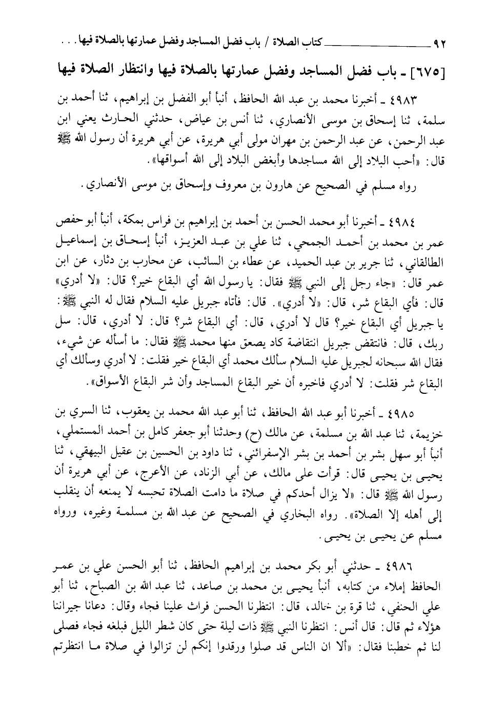 4983 - أَخْبَرَنَا مُحَمَّدُ بْنُ عَبْدِ اللهِ الْحَافِظُ، أنبأ أَبُو الْفَضْلِ بْنُ إِبْرَاهِيمَ، ثنا أَحْمَدُ بْنُ سَلَمَةَ، ثنا إِسْحَاقُ بْنُ مُوسَى الْأَنْصَارِيُّ، ثنا أَنَسُ بْنُ عِيَاضٍ، حَدَّثَنِي الْحَارِثُ يَعْنِي ابْنَ عَبْدِ الرَّحْمَنِ، عَنْ عَبْدِ الرَّحْمَنِ بْنِ مِهْرَانَ مَوْلَى أَبِي هُرَيْرَةَ، عَنْ أَبِي هُرَيْرَةَ أَنَّ رَسُولَ اللهِ صَلَّى اللهُ عَلَيْهِ وَسَلَّمَ قَالَ: " §أَحَبُّ الْبِلَادِ إِلَى اللهِ مَسَاجِدُهَا، وَأَبْغَضُ الْبِلَادِ إِلَى اللهِ أَسْوَاقُهَا ". رَوَاهُ مُسْلِمٌ فِي الصَّحِيحِ عَنْ هَارُونَ بْنِ مَعْرُوفٍ، وَإِسْحَاقَ بْنِ مُوسَى الْأَنْصَارِيِّ