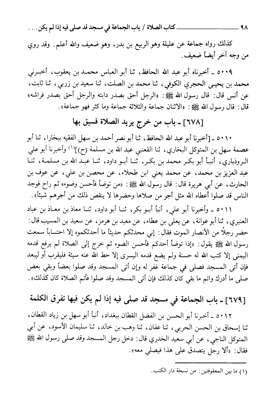 5010 - أَخْبَرَنَا أَبُو عَبْدِ اللهِ الْحَافِظُ، ثنا أَبُو نَصْرٍ أَحْمَدُ بْنُ سَهْلٍ الْفَقِيهُ بِبُخَارَا، ثنا أَبُو عِصْمَةَ سَهْلُ بْنُ الْمُتَوَكِّلِ الْبُخَارِيُّ، ثنا الْقَعْنَبِيُّ عَبْدُ اللهِ بْنُ مَسْلَمَةَ، ح وَأَخْبَرَنَا أَبُو عَلِيٍّ الرُّوذْبَارِيُّ، أنبأ أَبُو بَكْرٍ مُحَمَّدُ بْنُ بَكْرٍ، ثنا أَبُو دَاوُدَ، ثنا عَبْدُ اللهِ بْنُ مَسْلَمَةَ، ثنا عَبْدُ الْعَزِيزِ بْنُ مُحَمَّدٍ، عَنْ مُحَمَّدٍ يَعْنِي ابْنَ طَحْلَاءَ، عَنْ مِحْصَنِ بْنِ عَلِيٍّ، عَنْ عَوْفِ بْنِ الْحَارِثِ، عَنْ أَبِي هُرَيْرَةَ قَالَ: قَالَ رَسُولُ اللهِ صَلَّى اللهُ عَلَيْهِ وَسَلَّمَ: " §مَنْ تَوَضَّأَ فَأَحْسَنَ وُضُوءَهُ، ثُمَّ رَاحَ فَوَجَدَ النَّاسَ قَدْ صَلُّوا، أَعْطَاهُ اللهُ مِثْلَ أَجْرِ مَنْ صَلَّاهَا وَحَضَرَهَا لَا يَنْقُصُ ذَلِكَ مِنْ أَجْرِهِمْ شَيْئًا "