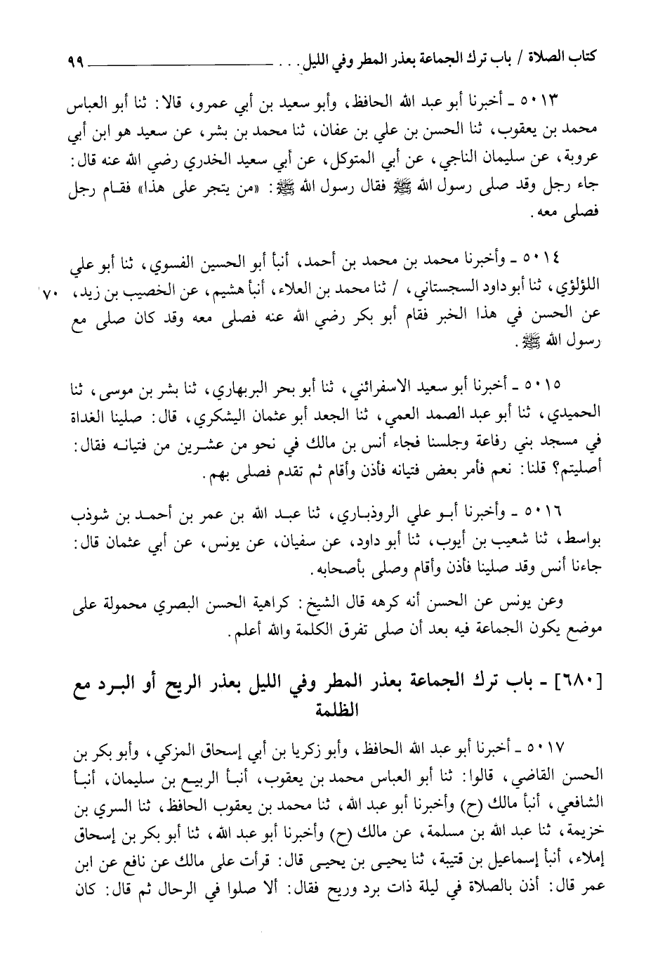 5017 - أَخْبَرَنَا أَبُو عَبْدِ اللهِ الْحَافِظُ، وَأَبُو زَكَرِيَّا بْنُ أَبِي إِسْحَاقَ الْمُزَكِّي، وَأَبُو بَكْرِ بْنُ الْحَسَنِ الْقَاضِي قَالُوا: ثنا أَبُو الْعَبَّاسِ مُحَمَّدُ بْنُ يَعْقُوبَ، أنبأ الرَّبِيعُ بْنُ سُلَيْمَانَ، أنبأ الشَّافِعِيُّ، أنبأ مَالِكٌ، ح وَأَخْبَرَنَا أَبُو عَبْدِ اللهِ، ثنا مُحَمَّدُ بْنُ يَعْقُوبَ الْحَافِظُ، ثنا السَّرِيُّ بْنُ خُزَيْمَةَ، ثنا عَبْدُ اللهِ بْنُ مَسْلَمَةَ، عَنْ مَالِكٍ، ح وَأَخْبَرَنَا أَبُو عَبْدِ اللهِ، ثنا أَبُو بَكْرِ بْنُ إِسْحَاقَ إِمْلَاءً، أنبأ إِسْمَاعِيلُ بْنُ قُتَيْبَةَ، ثنا يَحْيَى بْنُ يَحْيَى قَالَ: قَرَأْتُ عَلَى مَالِكٍ، عَنْ نَافِعٍ، عَنِ ابْنِ عُمَرَ قَالَ: أُذِّنَ بِالصَّلَاةِ فِي لَيْلَةٍ ذَاتِ بَرْدٍ وَرِيحٍ فَقَالَ: أَلَا صَلُّوا فِي الرِّحَالِ، ثُمَّ قَالَ: كَانَ -[100]- رَسُولُ اللهِ صَلَّى اللهُ عَلَيْهِ وَسَلَّمَ §يَأْمُرُ الْمُؤَذِّنَ إِذَا كَانَتْ لَيْلَةٌ بَارِدَةٌ ذَاتُ مَطَرٍ يَقُولُ: " أَلَا صَلُّوا فِي الرِّحَالِ ". لَفْظُ حَدِيثِ يَحْيَى، وَفِي حَدِيثِ الشَّافِعِيِّ قَالَ عَنِ ابْنِ عُمَرَ: إِنَّهُ أُذِّنَ وَالْبَاقِي سَوَاءٌ. رَوَاهُ الْبُخَارِيُّ فِي الصَّحِيحِ عَنْ عَبْدِ اللهِ بْنِ يُوسُفَ عَنْ مَالِكٍ، وَرَوَاهُ مُسْلِمٌ عَنْ يَحْيَى بْنِ يَحْيَى
