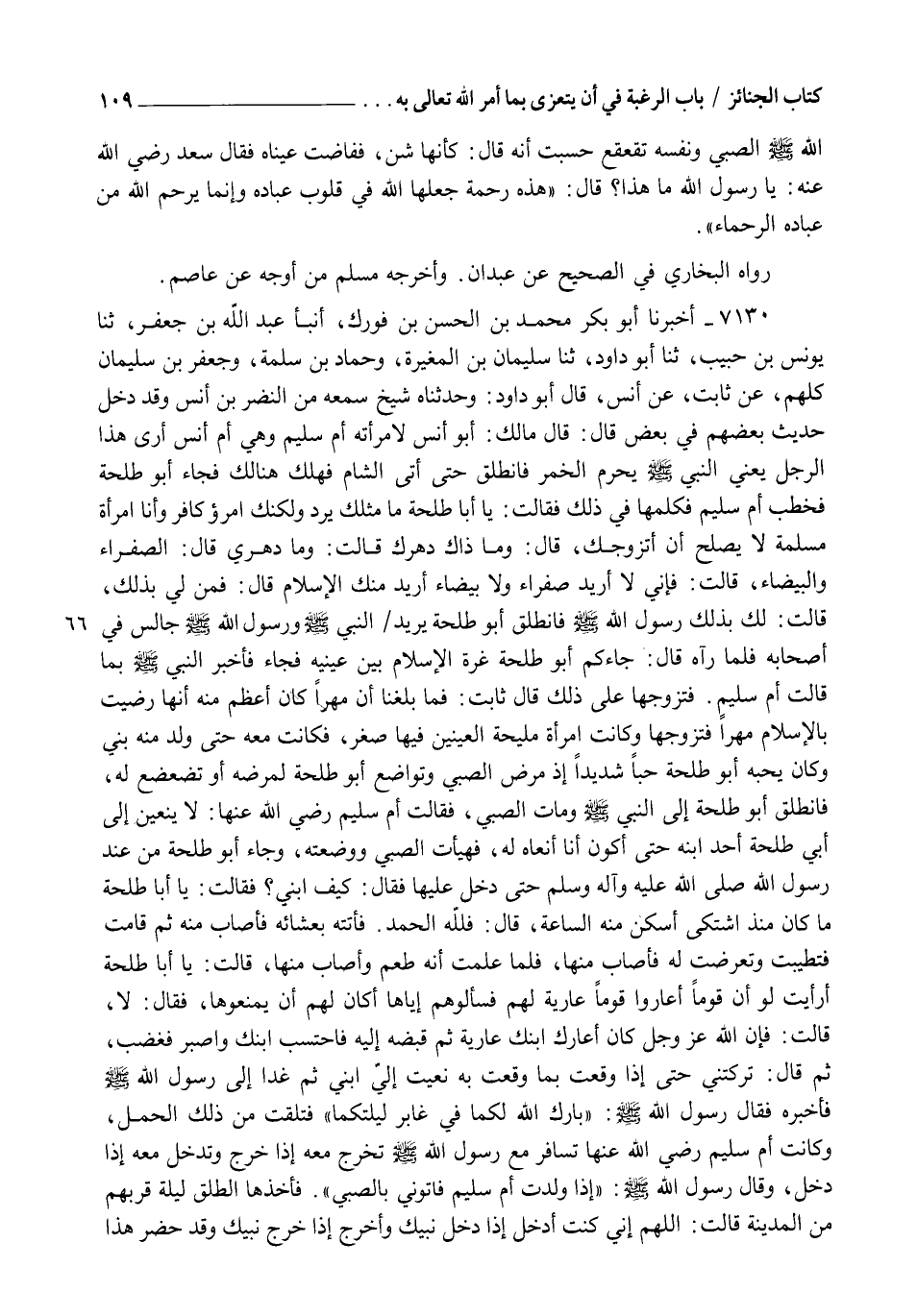 7130 - أَخْبَرَنَا أَبُو بَكْرٍ مُحَمَّدُ بْنُ الْحَسَنِ بْنِ فُورَكٍ , أنبأ عَبْدُ اللهِ بْنُ جَعْفَرٍ، ثنا يُونُسُ بْنُ حَبِيبٍ، ثنا أَبُو دَاوُدَ، ثنا سُلَيْمَانُ بْنُ الْمُغِيرَةِ، وَحَمَّادُ بْنُ سَلَمَةَ، وَجَعْفَرُ بْنُ سُلَيْمَانَ، كُلُّهُمْ عَنْ ثَابِتٍ، عَنْ أَنَسٍ، قَالَ أَبُو دَاوُدَ وَحَدَّثَنَاهُ شَيْخٌ، سَمِعَهُ مِنَ النَّضْرِ بْنِ أَنَسٍ، وَقَدْ دَخَلَ حَدِيثُ بَعْضِهِمْ فِي بَعْضٍ , قَالَ: قَالَ مَالِكٌ أَبُو أَنَسٍ لِامْرَأَتِهِ أُمِّ سُلَيْمٍ وَهِيَ أُمُّ أَنَسٍ: أَرَى هَذَا الرَّجُلَ يَعْنِي النَّبِيَّ صَلَّى اللهُ عَلَيْهِ وَسَلَّمَ يُحَرِّمُ الْخَمْرَ فَانْطَلَقَ حَتَّى أَتَى الشَّامَ فَهَلَكَ هُنَالِكَ , فَجَاءَ أَبُو طَلْحَةَ فَخَطَبَ أُمَّ سُلَيْمٍ فَكَلَّمَهَا فِي ذَلِكَ فَقَالَتْ: يَا أَبَا طَلْحَةَ مَا مِثْلُكَ يُرَدُّ وَلَكِنَّكَ امْرُؤٌ كَافِرٌ وَأَنَا امْرَأَةٌ مُسْلِمَةٌ لَا يَصْلُحُ أَنْ أَتَزَوَّجَكَ، قَالَ: وَمَا ذَاكَ دَهْرُكِ , قَالَتْ وَمَا دَهْرِي؟ قَالَ الصَّفْرَاءُ وَالْبَيْضَاءُ، قَالَتْ: فَإِنِّي لَا أُرِيدُ صَفْرَاءَ وَلَا بَيْضَاءَ أُرِيدُ مِنْكَ الْإِسْلَامَ، قَالَ: فَمَنْ لِي بِذَلِكَ؟ قَالَتْ: لَكَ بِذَلِكَ رَسُولُ اللهِ صَلَّى اللهُ عَلَيْهِ وَسَلَّمَ , فَانْطَلَقَ أَبُو طَلْحَةَ يُرِيدُ النَّبِيَّ صَلَّى اللهُ عَلَيْهِ وَسَلَّمَ وَرَسُولُ اللهِ صَلَّى اللهُ عَلَيْهِ وَسَلَّمَ جَالِسٌ فِي أَصْحَابِهِ فَلَمَّا رَآهُ قَالَ: §" جَاءَكُمْ أَبُو طَلْحَةَ غُرَّةُ الْإِسْلَامِ بَيْنَ عَيْنَيْهِ ". فَجَاءَ فَأَخْبَرَ النَّبِيَّ صَلَّى اللهُ عَلَيْهِ وَسَلَّمَ بِمَا قَالَتْ أُمُّ سُلَيْمٍ فَتَزَوَّجَهَا عَلَى ذَلِكَ , قَالَ ثَابِتٌ: فَمَا بَلَغَنَا أَنَّ مَهْرًا كَانَ أَعْظَمَ مِنْهُ أَنَّهَا رَضِيَتْ بِالْإِسْلَامِ مَهْرًا فَتَزَوَّجَهَا وَكَانَتِ امْرَأَةً مَلِيحَةَ الْعَيْنَيْنِ فِيهَا صِغَرٌ , فَكَانَتْ مَعَهُ حَتَّى وُلِدَ مِنْهُ بُنَيٌّ , وَكَانَ يُحِبُّهُ أَبُو طَلْحَةَ حُبًّا شَدِيدًا إِذْ مَرِضَ الصَّبِيُّ وَتَواضَعَ أَبُو طَلْحَةَ لِمَرَضِهِ أَوْ تَضَعْضَعَ لَهُ فَانْطَلَقَ أَبُو طَلْحَةَ إِلَى النَّبِيِّ صَلَّى اللهُ عَلَيْهِ وَسَلَّمَ وَمَاتَ الصَّبِيُّ , فَقَالَتْ أُمُّ سُلَيْمٍ رَضِيَ اللهُ عَنْهَا لَا يَنْعَيَنَّ إِلَى أَبِي طَلْحَةَ أَحَدٌ ابْنَهُ حَتَّى أَكُونَ أَنَا أَنْعَاهُ لَهُ، فَهَيَّأَتِ الصَّبِيَّ وَوَضَعَتْهُ، وَجَاءَ أَبُو طَلْحَةَ مِنْ عِنْدِ رَسُولِ اللهِ صَلَّى الله عَلَيْهِ وآله وَسَلَّمَ حَتَّى دَخَلَ عَلَيْهَا , فَقَالَ: كَيْفَ ابْنِي؟ فَقَالَتْ: يَا أَبَا طَلْحَةَ مَا كَانَ مُنْذُ اشْتَكَى أَسْكَنَ مِنْهُ السَّاعَةَ , قَالَ: فَلِلَّهِ الْحَمْدُ. فَأَتَتْهُ بِعَشَائِهِ فَأَصَابَ مِنْهُ ثُمَّ قَامَتْ فَتَطَيَّبَتْ وَتَعَرَّضَتْ لَهُ فَأَصَابَ مِنْهَا , فَلَمَّا عَلِمَتْ أَنَّهُ طَعِمَ وَأَصَابَ مِنْهَا قَالَتْ: يَا أَبَا طَلْحَةَ أَرَأَيْتَ لَوْ أَنَّ قَوْمًا أَعَارُوا قَوْمًا عَارِيَةً لَهُمْ فَسَأَلُوهُمْ إِيَّاهَا أَكَانَ لَهُمْ أَنْ يَمْنَعُوهَا؟ فَقَالَ: لَا , قَالَتْ: فَإِنَّ اللهَ عَزَّ وَجَلَّ كَانَ أَعَارَكَ ابْنَكَ عَارِيَةً ثُمَّ قَبَضَهُ إِلَيْهِ فَاحْتَسِبِ ابْنَكَ وَاصْبِرْ , فَغَضِبَ , ثُمَّ قَالَ تَرَكْتِنِي حَتَّى إِذَا وَقَعْتُ بِمَا وَقَعْتُ بِهِ نَعَيْتِ إِلَيَّ ابْنِي , ثُمَّ غَدَا إِلَى رَسُولِ اللهِ صَلَّى اللهُ عَلَيْهِ وَسَلَّمَ , فَأَخْبَرَهُ , فَقَالَ رَسُولُ اللهِ صَلَّى اللهُ عَلَيْهِ وَسَلَّمَ: " بَارَكَ اللهُ لَكُمَا فِي غَابِرِ لَيْلَتِكُمَا " فَتَلَقَّتْ مِنْ ذَلِكَ الْحَمْلِ وَكَانَتْ أُمُّ سُلَيْمٍ رَضِيَ اللهُ عَنْهَا تُسَافِرُ مَعَ رَسُولِ اللهِ صَلَّى اللهُ عَلَي