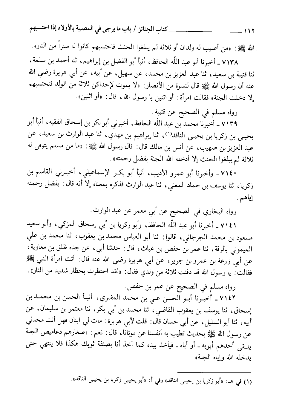 7142 - أَخْبَرَنَا أَبُو الْحَسَنِ عَلِيُّ بْنُ مُحَمَّدٍ الْمُقْرِئُ , أنبأ الْحَسَنُ بْنُ مُحَمَّدِ بْنُ إِسْحَاقَ، ثنا يُوسُفُ بْنُ يَعْقُوبَ الْقَاضِي، ثنا مُحَمَّدُ بْنُ أَبِي بَكْرٍ، ثنا مُعْتَمِرُ بْنُ سُلَيْمَانَ، عَنْ أَبِيهِ، ثنا أَبُو السَّلِيلِ، عَنْ أَبِي حَسَّانَ، قَالَ: قُلْتُ لِأَبِي هُرَيْرَةَ: مَاتَ لِيَ ابْنَانِ فَهَلْ أَنْتَ مُحَدِّثِي عَنْ رَسُولِ اللهِ صَلَّى اللهُ عَلَيْهِ وَسَلَّمَ بِحَدِيثٍ تُطَيِّبُ بِهِ أَنْفُسَنَا عَنْ مَوْتَانَا قَالَ: §" نَعَمْ صِغَارُهُمْ دَعَامِيصُ الْجَنَّةِ يَلْقَى أَحَدُهُمْ أَبَوَيْهِ أَوْ أَبَاهُ فَيَأْخُذُ بِيَدِهِ كَمَا آخُذُ أَنَا بِصَنِفَةِ ثَوْبِكَ هَكَذَا فَلَا يَنْتَهِي حَتَّى يُدْخِلَهُ اللهُ وَإِيَّاهُ الْجَنَّةَ ". -[113]-