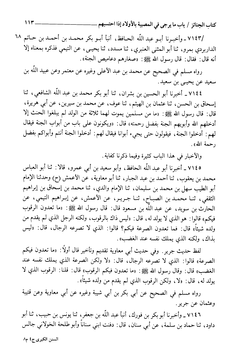 7144 - أَخْبَرَنَا أَبُو الْحُسَيْنِ بْنُ بِشْرَانِ، ثنا أَبُو بَكْرٍ مُحَمَّدُ بْنُ عَبْدِ اللهِ الشَّافِعِيُّ , ثنا إِسْحَاقُ بْنُ الْحَسَنِ، ثنا عُثْمَانُ بْنُ الْهَيْثَمِ، ثنا عَوْفٌ، عَنْ مُحَمَّدِ بْنِ سِيرِينَ، عَنْ أَبِي هُرَيْرَةَ، قَالَ: قَالَ رَسُولُ اللهِ صَلَّى اللهُ عَلَيْهِ وَسَلَّمَ: §" مَا مِنْ مُسْلِمَيْنِ يَمُوتُ لَهُمَا ثَلَاثَةٌ مِنَ الْوَلَدِ لَمْ يَبْلُغُوا الْحِنْثَ إِلَّا أَدْخَلَهُمُ اللهُ وَأَبَوَيْهِمُ الْجَنَّةَ بِفَضْلِ رَحْمَتِهِ " , قَالَ: " وَيَكُونُونَ عَلَى بَابٍ مِنْ أَبْوَابِ الْجَنَّةِ , فَيُقَالُ لَهُمُ ادْخُلُوا الْجَنَّةَ، فَيَقُولُونَ حَتَّى يَجِئَ أَبَوَانَا , فَيُقَالُ لَهُمُ ادْخُلُوا الْجَنَّةَ أَنْتُمْ وَأَبَوَاكُمْ بِفَضْلِ رَحْمَةِ اللهِ ". وَالْأَخْبَارُ فِي هَذَا الْبَابِ كَثِيرَةٌ وَفِيمَا ذَكَرْنَا كِفَايَةٌ