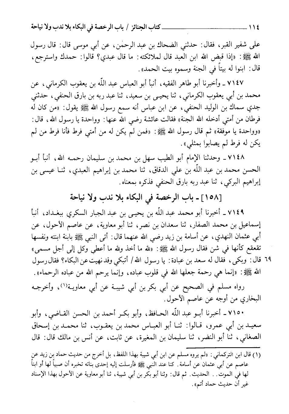 7149 - أَخْبَرَنَا أَبُو مُحَمَّدٍ عَبْدُ اللهِ بْنُ يَحْيَى بْنِ عَبْدِ الْجَبَّارِ السُّكَّرِيُّ، بِبَغْدَادَ , أنبأ إِسْمَاعِيلُ بْنُ مُحَمَّدٍ الصَّفَّارُ، ثنا سَعْدَانُ بْنُ نَصْرٍ، ثنا أَبُو مُعَاوِيَةَ، عَنْ عَاصِمٍ الْأَحْوَلِ، عَنْ أَبِي عُثْمَانَ النَّهْدِيِّ، عَنْ أُسَامَةَ بْنِ زَيْدٍ، رَضِيَ اللهُ عَنْهُمَا قَالَ: أَتَى النَّبِيُّ صَلَّى اللهُ عَلَيْهِ وَسَلَّمَ بِابْنَةِ ابْنَتِهِ وَنَفْسُهَا تَقَعْقَعُ كَأَنَّهَا فِي شَنٍّ فَقَالَ رَسُولُ اللهِ صَلَّى اللهُ عَلَيْهِ وَسَلَّمَ: §" لِلَّهِ مَا أَخَذَ وَلِلَّهِ مَا أَعْطَى وَكُلٌّ إِلَى أَجَلٍ مُسَمًّى " , قَالَ: وَبَكَى , فَقَالَ لَهُ سَعْدُ بْنُ عُبَادَةَ يَا رَسُولَ اللهِ أَتَبْكِي وَقَدْ نَهَيْتَ عَنِ الْبُكَاءِ؟ فَقَالَ رَسُولُ اللهِ صَلَّى اللهُ عَلَيْهِ وَسَلَّمَ: " إِنَّمَا هِيَ رَحْمَةٌ جَعَلَهَا اللهُ فِي قُلُوبِ عِبَادِهِ وَإِنَّمَا يَرْحَمُ اللهُ مِنْ عِبَادِهِ الرُّحَمَاءَ ". رَوَاهُ مُسْلِمٌ فِي الصَّحِيحِ عَنْ أَبِي بَكْرِ بْنِ أَبِي شَيْبَةَ عَنْ أَبِي مُعَاوِيَةَ وَأَخْرَجَهُ الْبُخَارِيُّ مِنْ أَوْجُهٍ عَنْ عَاصِمٍ الْأَحْوَلِ