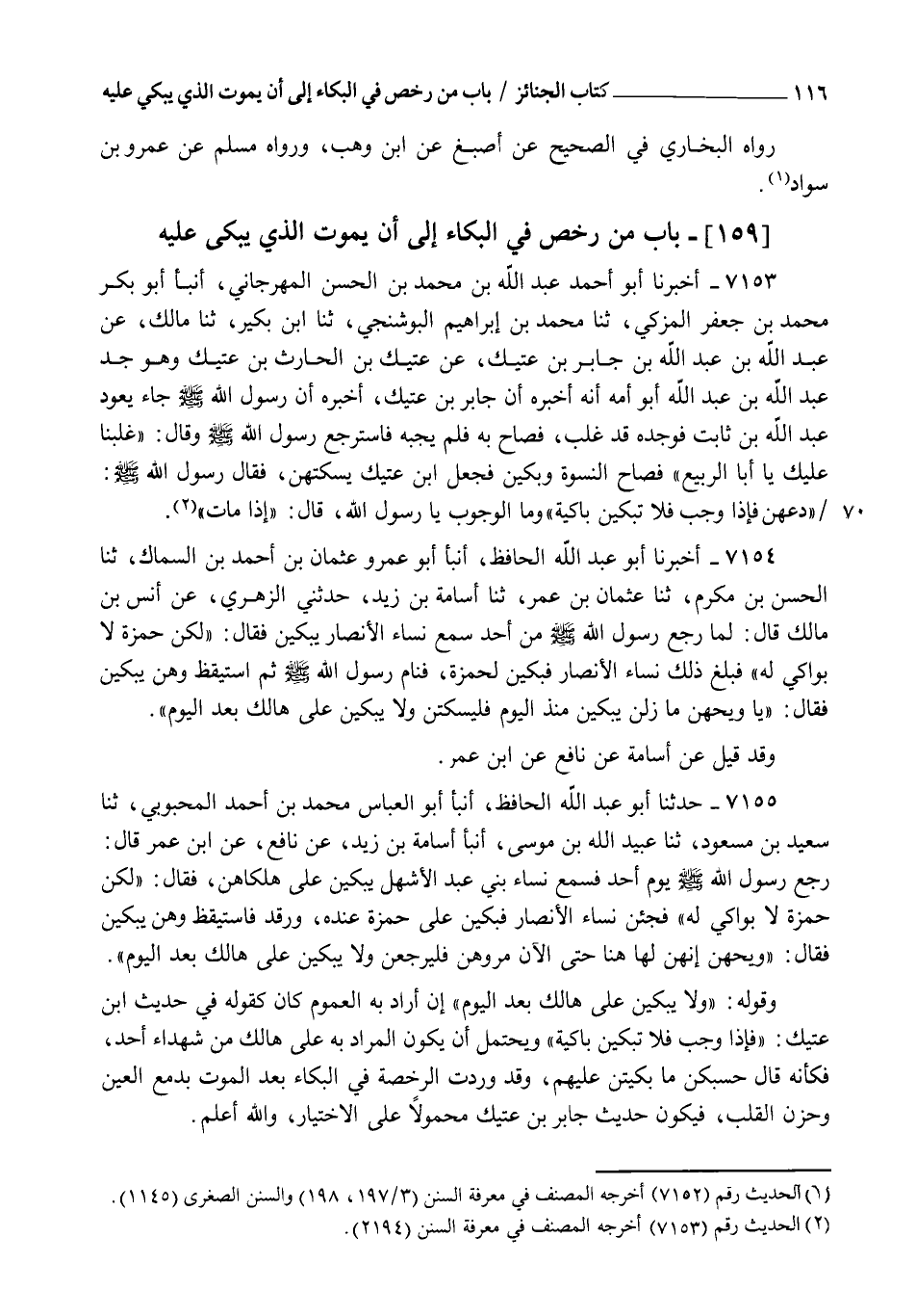 7153 - أَخْبَرَنَا أَبُو أَحْمَدَ عَبْدُ اللهِ بْنُ مُحَمَّدِ بْنِ الْحَسَنِ الْمِهْرَجَانِيُّ، أنبأ أَبُو بَكْرٍ مُحَمَّدُ بْنُ جَعْفَرٍ الْمُزَكِّي , ثنا مُحَمَّدُ بْنُ إِبْرَاهِيمَ الْبُوشَنْجِيُّ، ثنا ابْنُ بُكَيْرٍ، ثنا مَالِكٌ، عَنْ عَبْدِ اللهِ بْنِ عَبْدِ اللهِ بْنِ جَابِرِ بْنِ عَتِيكٍ، عَنْ عَتِيكِ بْنِ الْحَارِثِ بْنِ عَتِيكٍ، وَهُوَ جَدُّ عَبْدِ اللهِ بْنِ عَبْدِ اللهِ أَبُو أُمِّهِ أَنَّهُ أَخْبَرَهُ , أَنَّ جَابِرَ بْنَ عَتِيكٍ أَخْبَرَهُ، أَنَّ رَسُولَ اللهِ صَلَّى اللهُ عَلَيْهِ وَسَلَّمَ جَاءَ يَعُودُ عَبْدَ اللهِ بْنَ ثَابِتٍ فَوَجَدَهُ قَدْ غُلِبَ فَصَاحَ بِهِ فَلَمْ يُجِبْهُ فَاسْتَرْجَعَ رَسُولُ اللهِ صَلَّى اللهُ عَلَيْهِ وَسَلَّمَ وَقَالَ: " غُلِبْنَا عَلَيْكَ يَا أَبَا الرَّبِيعِ "، فَصَاحَ النِّسْوَةُ وَبَكَيْنَ فَجَعَلَ ابْنُ عَتِيكٍ يُسَكِّتُهُنَّ فَقَالَ رَسُولُ اللهِ صَلَّى اللهُ عَلَيْهِ وَسَلَّمَ: §" دَعْهُنَّ فَإِذَا وَجَبَ فَلَا تَبْكِيَنَّ بَاكِيَةٌ وَمَا الْوُجُوبُ يَا رَسُولَ اللهِ قَالَ: " إِذَا مَاتَ "
