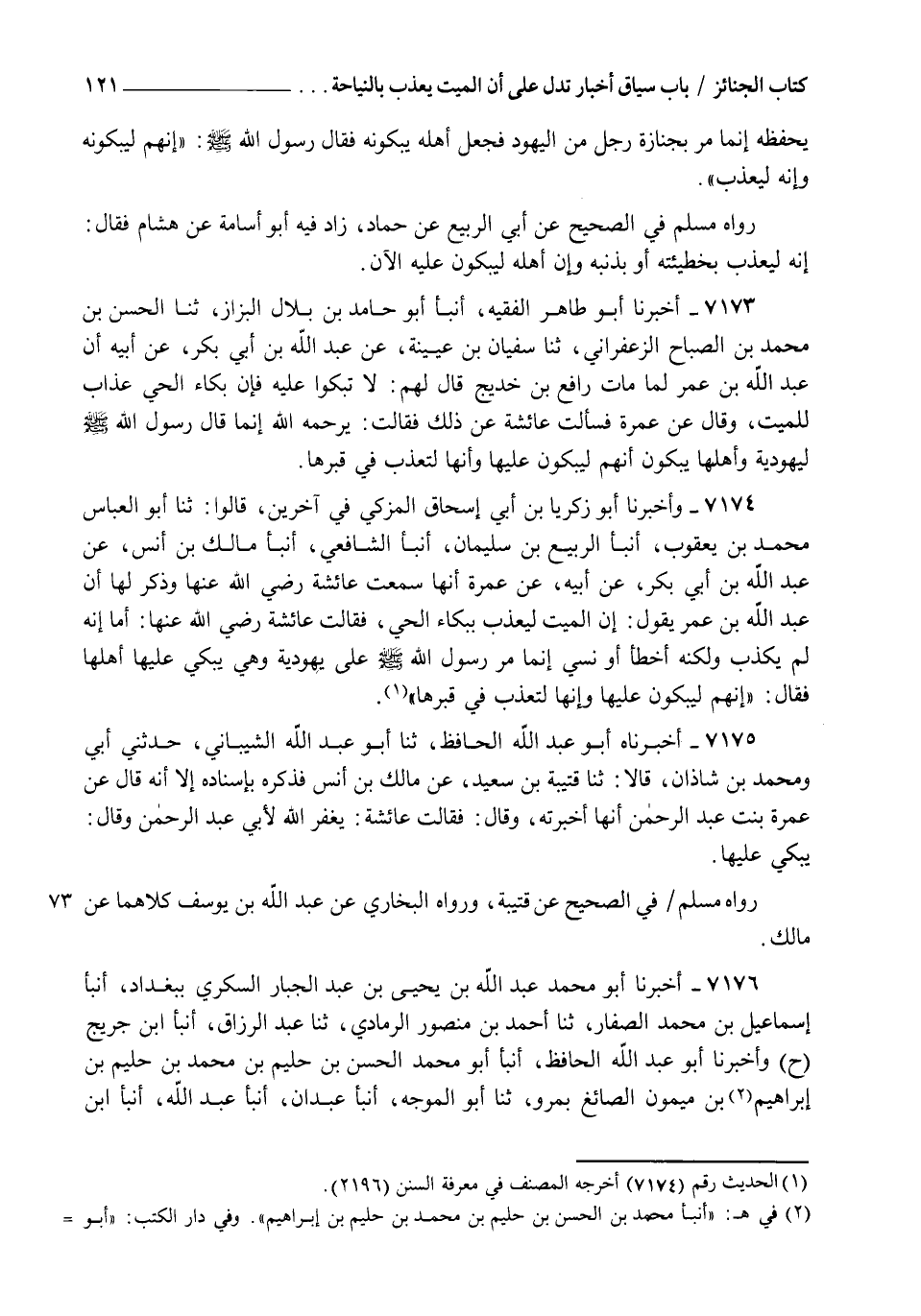 7173 - أَخْبَرَنَا أَبُو طَاهِرٍ الْفَقِيهُ، أنبأ أَبُو حَامِدِ بْنُ بِلَالٍ الْبَزَّازُ، ثنا الْحَسَنُ بْنُ مُحَمَّدِ بْنِ الصَّبَّاحِ الزَّعْفَرَانِيُّ، ثنا سُفْيَانُ بْنُ عُيَيْنَةَ، عَنْ عَبْدِ اللهِ بْنِ أَبِي بَكْرٍ، عَنْ أَبِيهِ، أَنَّ عَبْدَ اللهِ بْنَ عُمَرَ، لَمَّا مَاتَ رَافِعُ بْنُ خَدِيجٍ قَالَ لَهُمْ: لَا تَبْكُوا عَلَيْهِ فَإِنَّ بُكَاءَ الْحِيِّ عَذَابٌ لِلْمَيِّتِ , وَقَالَ عَنْ عَمْرَةَ فَسَأَلْتُ عَائِشَةَ عَنْ ذَلِكَ , فَقَالَتْ: يَرْحَمُهُ اللهُ إِنَّمَا قَالَ رَسُولُ اللهِ صَلَّى اللهُ عَلَيْهِ وَسَلَّمَ لِيَهُودِيَّةٍ , وَأَهْلُهَا يَبْكُونَ: §" إِنَّهُمْ لَيَبْكُونَ عَلَيْهَا وَإِنَّهَا لَتُعَذَّبُ فِي قَبْرِهَا "