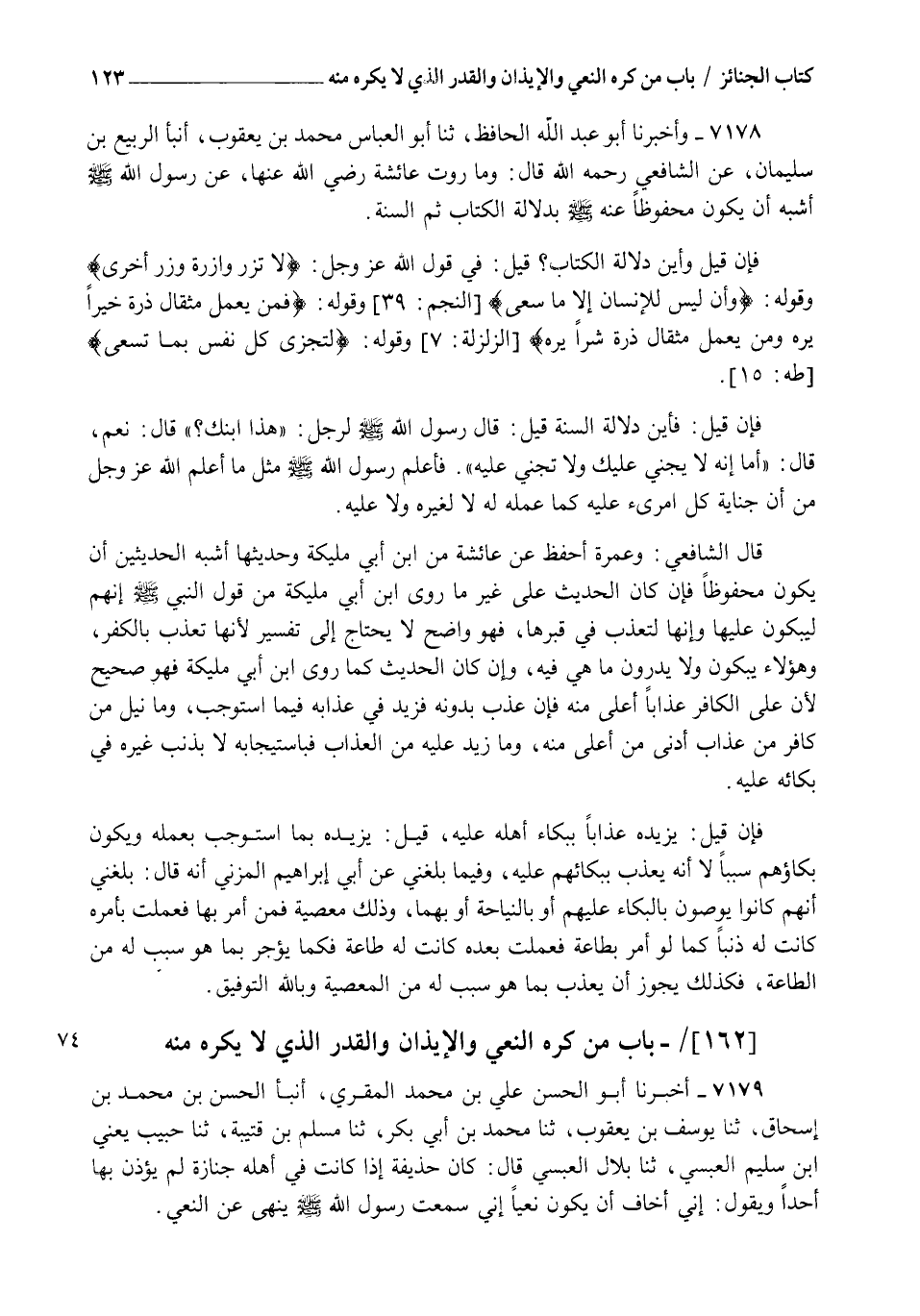 7179 - أَخْبَرَنَا أَبُو الْحَسَنِ عَلِيُّ بْنُ مُحَمَّدٍ الْمُقْرِئُ أنبأ الْحَسَنُ بْنُ مُحَمَّدِ بْنِ إِسْحَاقَ، ثنا يُوسُفُ بْنُ يَعْقُوبَ، ثنا مُحَمَّدُ بْنُ أَبِي بَكْرٍ، ثنا مُسْلِمُ بْنُ قُتَيْبَةَ، ثنا حَبِيبٌ يَعْنِي ابْنَ سُلَيْمٍ الْعَبْسِيَّ، ثنا بِلَالٌ الْعَبْسِيُّ، قَالَ: كَانَ حُذَيْفَةُ إِذَا كَانَتْ فِي أَهْلِهِ جِنَازَةٌ لَمْ يُؤْذِنْ بِهَا أَحَدًا وَيَقُولُ: " إِنِّي أَخَافُ أَنْ يَكُونَ نَعْيًا إِنِّي سَمِعْتُ رَسُولَ اللهِ صَلَّى اللهُ عَلَيْهِ وَسَلَّمَ §يَنْهَى عَنِ النَّعْيِ " -[124]- وَيُرْوَى فِي ذَلِكَ عَنِ ابْنِ مَسْعُودٍ وَابْنِ عُمَرَ , وَأَبِي سَعِيدٍ ثُمَّ عَنْ عَلْقَمَةَ , وَابْنِ الْمُسَيِّبِ وَالرَّبِيعِ بْنِ خَيْثَمٍ , وَإِبْرَاهِيمَ النَّخَعِيِّ وَبَلَغَنِي عَنْ مَالِكِ بْنِ أَنَسٍ أَنَّهُ قَالَ: لَا أُحِبُّ الصِّيَاحَ لِمَوْتِ الرَّجُلِ عَلَى أَبْوَابِ الْمَسَاجِدِ وَلَوْ وَقَفَ عَلَى حِلَقِ الْمَسَاجِدِ فَأَعْلَمَ النَّاسِ بِمَوْتِهِ لَمْ يَكُنْ بِهِ بَأْسٌ وَرُوِّينَا عَنْ أَنَسِ بْنِ مَالِكٍ أَنَّ النَّبِيَّ صَلَّى اللهُ عَلَيْهِ وَسَلَّمَ نَعَى جَعْفَرًا وَزَيْدًا وَابْنَ رَوَاحَةَ وَعَنْ أَبِي هُرَيْرَةَ رَضِيَ اللهُ عَنْهُ أَنَّ النَّبِيَّ صَلَّى اللهُ عَلَيْهِ وَسَلَّمَ نَعَى النَّجَاشِيَّ وَعَنْهُ فِي مَوْتِ الْإِنْسَانِ الَّذِي كَانَ يَقُمُّ الْمَسْجِدَ وَدُفِنَ لَيْلًا أَفَلَا كُنْتُمْ آذَنْتُمُونِي وَفِي رِوَايَةٍ مَا مَنَعَكُمْ أَنْ تُعْلِمُونِي؟
