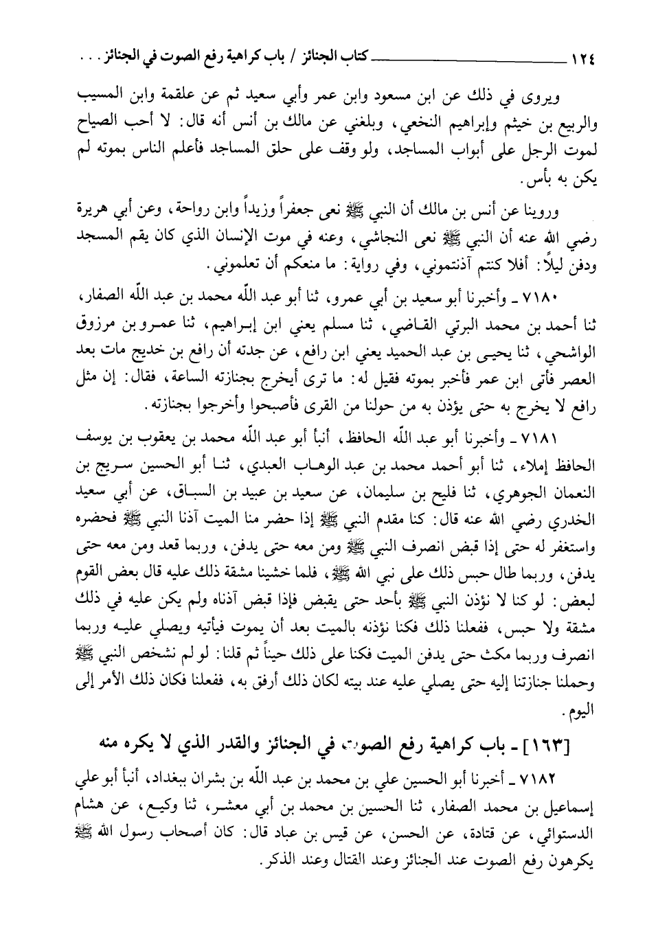 7182 - أَخْبَرَنَا أَبُو الْحُسَيْنِ عَلِيُّ بْنُ مُحَمَّدِ بْنِ عَبْدِ اللهِ بْنِ بِشْرَانَ بِبَغْدَادَ , أنبأ أَبُو عَلِيٍّ إِسْمَاعِيلُ بْنُ مُحَمَّدٍ الصَّفَّارُ ثنا الْحُسَيْنُ بْنُ مُحَمَّدِ بْنِ أَبِي مَعْشَرٍ، ثنا وَكِيعٌ، عَنْ هِشَامٍ الدَّسْتُوَائِيِّ، عَنْ قَتَادَةَ، عَنِ الْحَسَنِ، عَنْ قَيْسِ بْنِ عَبَّادٍ، قَالَ " كَانَ أَصْحَابُ رَسُولِ اللهِ صَلَّى اللهُ عَلَيْهِ وَسَلَّمَ §يَكْرَهُونَ رَفْعَ الصَّوْتِ عِنْدَ الْجَنَائِزِ وَعِنْدَ الْقِتَالِ وَعِنْدَ الذِّكْرِ "