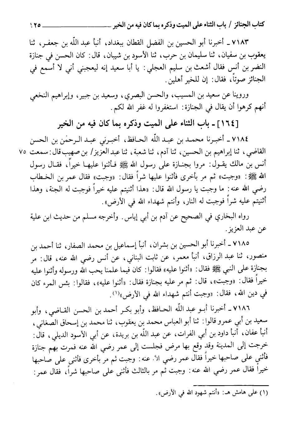 7184 - أَخْبَرَنَا مُحَمَّدُ بْنُ عَبْدِ اللهِ الْحَافِظُ، أَخْبَرَنِي عَبْدُ الرَّحْمَنِ بْنُ الْحَسَنِ الْقَاضِي، ثنا إِبْرَاهِيمُ بْنُ الْحُسَيْنِ، ثنا آدَمُ، ثنا شُعْبَةُ، ثنا عَبْدُ الْعَزِيزِ بْنُ صُهَيْبٍ، قَالَ: سَمِعْتُ أَنَسَ بْنَ مَالِكٍ، يَقُولُ: مَرُّوا بِجِنَازَةٍ عَلَى رَسُولِ اللهِ صَلَّى اللهُ عَلَيْهِ وَسَلَّمَ فَأَثْنَوْا عَلَيْهَا خَيْرًا , فَقَالَ رَسُولُ اللهِ صَلَّى اللهُ عَلَيْهِ وَسَلَّمَ: " وَجَبَتْ " ثُمَّ مُرَّ بِأُخْرَى فَأَثْنَوْا عَلَيْهَا شَرًّا فَقَالَ: " وَجَبَتْ " فَقَالَ عُمَرُ بْنُ الْخَطَّابِ رَضِيَ اللهُ عَنْهُ: مَا وَجَبَتْ يَا رَسُولَ اللهِ قَالَ: §" هَذَا أَثْنَيْتُمْ عَلَيْهِ خَيْرًا فَوَجَبَتْ لَهُ الْجَنَّةُ وَهَذَا أَثْنَيْتُمْ عَلَيْهِ شَرًّا فَوَجَبَتْ لَهُ النَّارُ وَأَنْتُمْ شُهَدَاءُ اللهِ فِي الْأَرْضِ "، رَوَاهُ الْبُخَارِيُّ فِي الصَّحِيحِ عَنْ آدَمَ بْنِ أَبِي إِيَاسٍ، وَأَخْرَجَهُ مُسْلِمٌ مِنْ حَدِيثِ ابْنِ عُلَيَّةَ عَنْ عَبْدِ الْعَزِيزِ