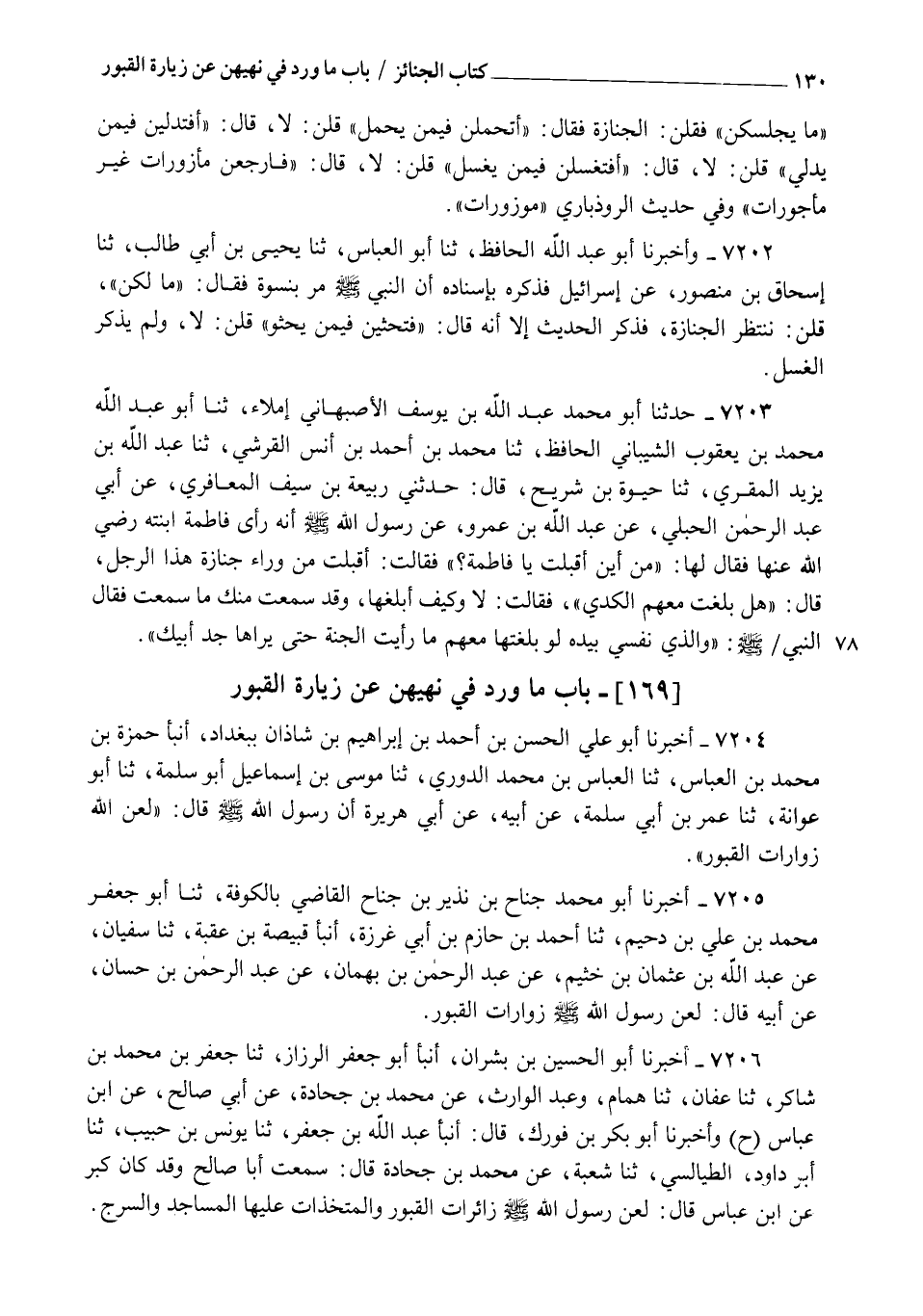 7205 - أَخْبَرَنَا أَبُو مُحَمَّدٍ جَنَاحُ بْنُ نُذَيْرِ بْنِ جَنَاحٍ الْقَاضِي بِالْكُوفَةِ , ثنا أَبُو جَعْفَرٍ مُحَمَّدُ بْنُ عَلِيِّ بْنِ دُحَيْمٍ , ثنا أَحْمَدُ بْنُ حَازِمِ بْنِ أَبِي غَرَزَةَ، أنبأ قَبِيصَةُ بْنُ عُقْبَةَ، ثنا سُفْيَانُ، عَنْ عَبْدِ اللهِ بْنِ عُثْمَانَ بْنِ خُثَيْمٍ، عَنْ عَبْدِ الرَّحْمَنِ بْنِ بَهْمَانَ، عَنْ عَبْدِ الرَّحْمَنِ بْنِ حَسَّانَ، عَنْ أَبِيهِ، قَالَ: §" لَعَنَ رَسُولُ اللهِ صَلَّى اللهُ عَلَيْهِ وَسَلَّمَ زَوَّارَاتِ الْقُبُورِ "