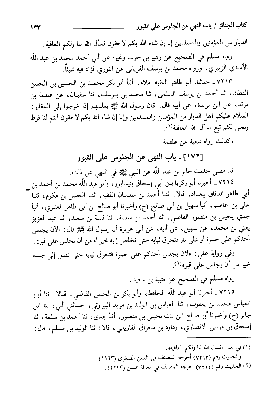 7215 - أَخْبَرَنَا أَبُو عَبْدِ اللهِ الْحَافِظُ، وَأَبُو بَكْرِ بْنُ الْحَسَنِ الْقَاضِي قَالَا: ثنا أَبُو الْعَبَّاسِ مُحَمَّدُ بْنُ يَعْقُوبَ , ثنا الْعَبَّاسُ بْنُ الْوَلِيدِ بْنِ مَزْيَدَ الَبَيْرُوتِيُّ، حَدَّثَنِي أَبِي، ثنا ابْنُ جَابِرٍ، ح وَأَخْبَرَنَا أَبُو صَالِحِ بْنُ بِنْتِ يَحْيَى بْنِ مَنْصُورٍ، أنبأ جَدِّي، ثنا أَحْمَدُ بْنُ سَلَمَةَ، ثنا إِسْحَاقُ بْنُ مُوسَى الْأَنْصَارِيُّ، وَدَاوُدُ بْنُ مِخْرَاقٍ الْفَارَيَابِيُّ، قَالَا: ثنا الْوَلِيدُ بْنُ مُسْلِمٍ، قَالَ -[134]- سَمِعْتُ عَبْدَ الرَّحْمَنِ بْنَ يَزِيدَ بْنِ جَابِرٍ، يَقُولُ حَدَّثَنِي بُسْرُ بْنُ عُبَيْدِ اللهِ الْحَضْرَمِيُّ، أَنَّهُ سَمِعَ وَاثِلَةَ بْنَ الْأَسْقَعِ اللَّيْثِيَّ، يَقُولُ سَمِعْتُ أَبَا مَرْثَدٍ الْغَنَوِيَّ، يَقُولُ: سَمِعْتُ رَسُولَ اللهِ صَلَّى اللهُ عَلَيْهِ وَسَلَّمَ يَقُولُ: §" لَا تَجْلِسُوا عَلَى الْقُبُورِ وَلَا تُصَلُّوا إِلَيْهَا " لَفْظُ حَدِيثِهِمَا سَوَاءٌ إِلَّا أَنَّ فِي رِوَايَةِ ابْنِ مَزْيَدَ عَنْ وَاثِلَةَ بْنِ الْأَسْقَعِ قَالَ: حَدَّثَنِي أَبُو مَرْثَدٍ الْغَنَوِيُّ. رَوَاهُ مُسْلِمٌ فِي الصَّحِيحِ عَنْ عَلِيِّ بْنِ حُجْرٍ عَنِ الْوَلِيدِ بْنِ مُسْلِمٍ. وَرَوَاهُ ابْنُ الْمُبَارَكِ عَنِ ابْنِ جَابِرٍ عَنْ بُسْرٍ عَنْ أَبِي إِدْرِيسَ الْخَوْلَانِيِّ عَنْ وَاثِلَةَ، وَقَدْ مَضَى فِي كِتَابِ الصَّلَاةِ، وَرُوِّينَا عَنِ ابْنِ مَسْعُودٍ وَابْنِ عُمَرَ فِي كَرَاهِيَةِ ذَلِكَ وَالتَّشْدِيدِ فِيهِ