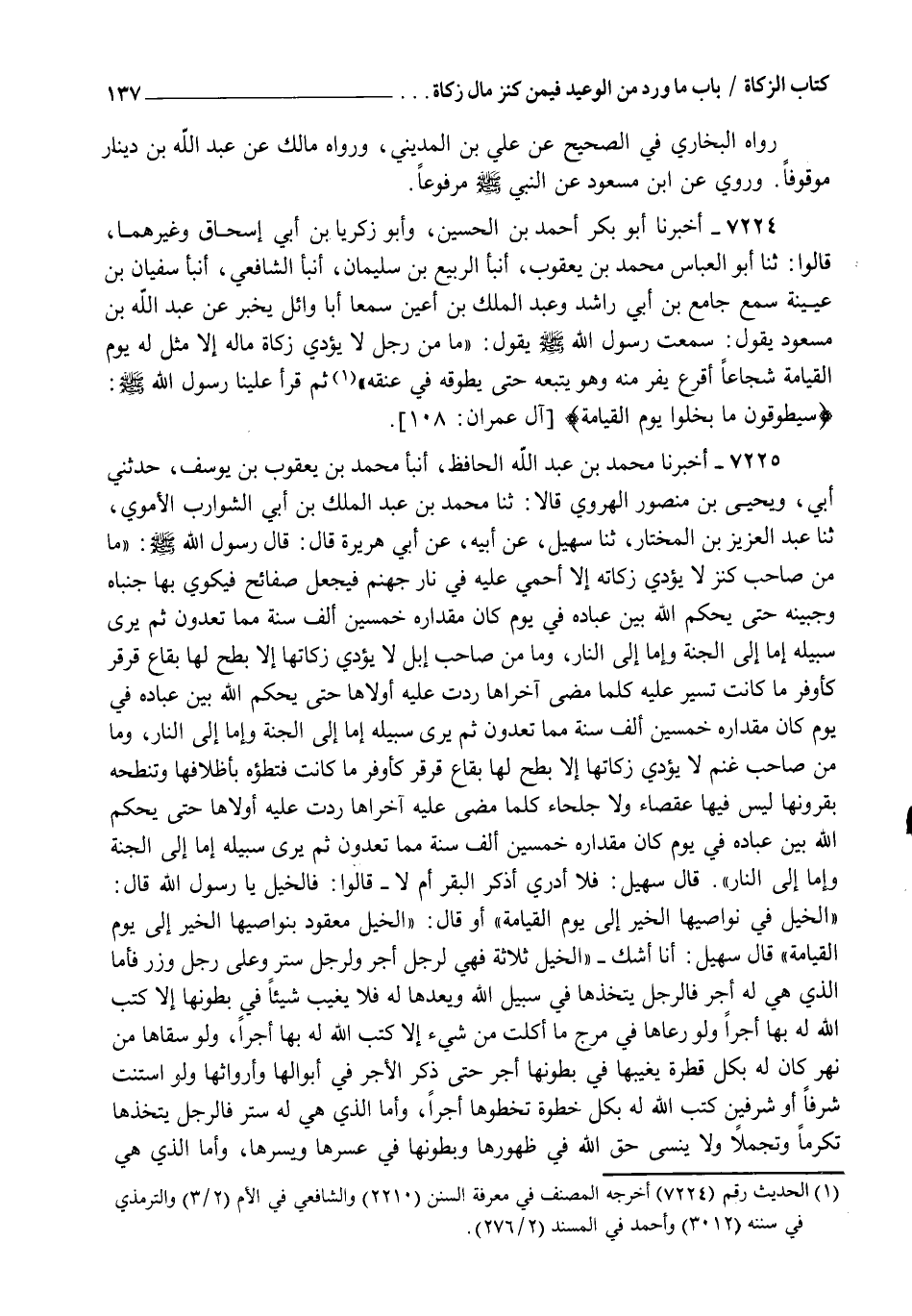 7224 - أَخْبَرَنَا أَبُو بَكْرٍ أَحْمَدُ بْنُ الْحُسَيْنِ وَأَبُو زَكَرِيَّا بْنُ أَبِي إِسْحَاقَ وَغَيْرُهُمَا، قَالُوا: ثنا أَبُو الْعَبَّاسِ مُحَمَّدُ بْنُ يَعْقُوبَ، أنبأ الرَّبِيعُ بْنُ سُلَيْمَانَ، أنبأ الشَّافِعِيُّ، أنبأ سُفْيَانُ بْنُ عُيَيْنَةَ، سَمِعَ جَامِعَ بْنَ أَبِي رَاشِدٍ، وَعَبْدَ الْمَلِكِ بْنَ أَعْيَنَ، سَمِعَا أَبَا وَائِلٍ، يُخْبِرُ عَنْ عَبْدِ اللهِ بْنِ مَسْعُودٍ، يَقُولُ: سَمِعْتُ رَسُولَ اللهِ صَلَّى اللهُ عَلَيْهِ وَسَلَّمَ يَقُولُ: §" مَا مِنْ رَجُلٍ لَا يُؤَدِّي زَكَاةَ مَالِهِ إِلَّا مُثِّلَ لَهُ يَوْمَ الْقِيَامَةِ شُجَاعًا أَقْرَعَ يَفِرُّ مِنْهُ وَهُوَ يَتْبَعُهُ حَتَّى يُطَوَّقَهُ فِي عُنُقِهِ " ثُمَّ قَرَأَ عَلَيْنَا رَسُولُ اللهِ صَلَّى اللهُ عَلَيْهِ وَسَلَّمَ {سَيُطَوَّقُونَ مَا بَخِلُوا يَوْمَ الْقِيَامَةِ}