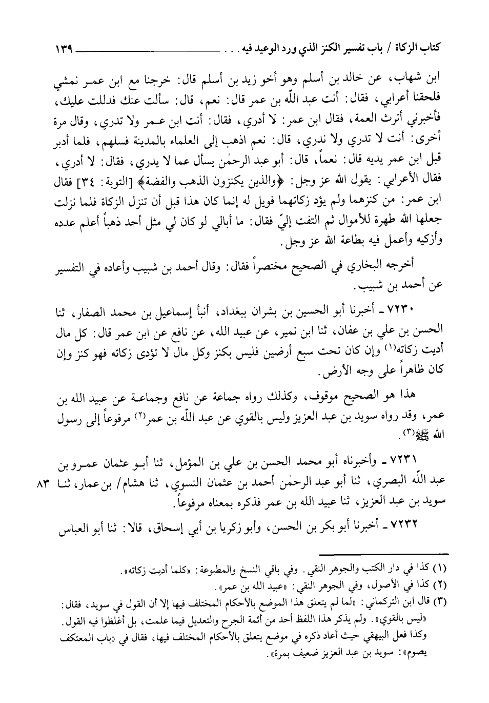 7230 - أَخْبَرَنَا أَبُو الْحُسَيْنِ بْنُ بِشْرَانَ، بِبَغْدَادَ أنبأ إِسْمَاعِيلُ بْنُ مُحَمَّدٍ الصَّفَّارُ، ثنا الْحَسَنُ بْنُ عَلِيِّ بْنِ عَفَّانَ، ثنا ابْنُ نُمَيْرٍ، عَنْ عُبَيْدِ اللهِ، عَنْ نَافِعٍ، عَنِ ابْنِ عُمَرَ، قَالَ: §" كُلُّ مَالٍ أَدَّيْتَ زَكَاتَهُ وَإِنْ كَانَ تَحْتَ سَبْعِ أَرَضِينَ فَلَيْسَ بِكَنْزٍ، وَكُلُّ مَالٍ لَا تُؤَدِّي زَكَاتَهُ فَهُوَ كَنْزٌ وَإِنْ كَانَ ظَاهِرًا عَلَى وَجْهِ الْأَرْضِ " هَذَا هُوَ الصَّحِيحُ مَوْقُوفٌ، وَكَذَلِكَ رَوَاهُ جَمَاعَةٌ عَنْ نَافِعٍ وَجَمَاعَةٌ عَنْ عُبَيْدِ اللهِ بْنِ عُمَرَ وَقَدْ رَوَاهُ سُوَيْدُ بْنُ عَبْدِ الْعَزِيزِ وَلَيْسَ بِالْقَوِيِّ عَنْ عَبْدِ اللهِ بْنِ عُمَرَ مَرْفُوعًا إِلَى رَسُولِ اللهِ صَلَّى اللهُ عَلَيْهِ وَسَلَّمَ