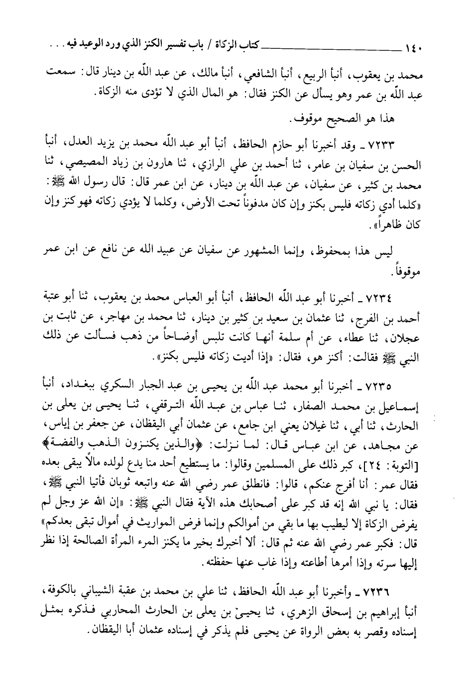 7233 - وَقَدْ أَخْبَرَنَا أَبُو حَازِمٍ الْحَافِظُ، أنبأ أَبُو عَبْدِ اللهِ مُحَمَّدُ بْنُ يَزِيدَ الْعَدْلُ أنبأ الْحَسَنُ بْنُ سُفْيَانَ بْنِ عَامِرٍ، ثنا أَحْمَدُ بْنُ عَلِيٍّ الرَّازِيُّ، ثنا هَارُونُ بْنُ زِيَادٍ الْمِصِّيصِيُّ، ثنا مُحَمَّدُ بْنُ كَثِيرٍ، عَنْ سُفْيَانَ، عَنَ عَبْدِ اللهِ بْنِ دِينَارٍ، عَنِ ابْنِ عُمَرَ، قَالَ: قَالَ رَسُولُ اللهِ صَلَّى اللهُ عَلَيْهِ وَسَلَّمَ: §" كُلُّ مَا أَدَّى زَكَاتَهُ فَلَيْسَ بِكَنْزٍ وَإِنْ كَانَ مَدْفُونًا تَحْتَ الْأَرْضِ وَكُلُّ مَا لَا يُؤَدِّي زَكَاتَهُ فَهُوَ كَنْزٌ وَإِنْ كَانَ ظَاهِرًا " لَيْسَ هَذَا بِمَحْفُوظٍ وَإِنَّمَا الْمَشْهُورُ عَنْ سُفْيَانَ عَنْ عُبَيْدِ اللهِ عَنْ نَافِعٍ عَنِ ابْنِ عُمَرَ مَوْقُوفًا