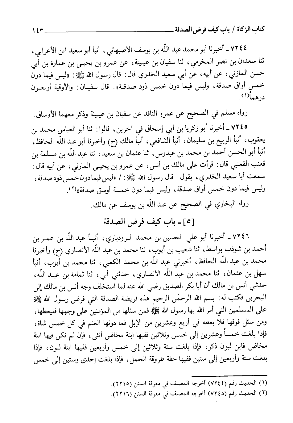 7244 - أَخْبَرَنَا أَبُو مُحَمَّدٍ عَبْدُ اللهِ بْنُ يُوسُفَ الْأَصْبَهَانِيُّ، أنبأ أَبُو سَعِيدِ بْنُ الْأَعْرَابِيِّ، ثنا سَعْدَانُ بْنُ نَصْرٍ الْمَخْرَمِيُّ، ثنا سُفْيَانُ بْنُ عُيَيْنَةَ، عَنْ عَمْرِو بْنِ يَحْيَى بْنِ عُمَارَةَ بْنِ أَبِي حَسَنٍ الْمَازِنِيِّ، عَنْ أَبِيهِ، عَنْ أَبِي سَعِيدٍ الْخُدْرِيِّ، قَالَ: قَالَ رَسُولُ اللهِ صَلَّى اللهُ عَلَيْهِ وَسَلَّمَ: §" لَيْسَ فِيمَا دُونَ خَمْسِ أَوَاقٍ صَدَقَةٌ وَلَيْسَ فِيمَا دُونَ خَمْسِ ذَوْدٍ صَدَقَةٌ " قَالَ سُفْيَانُ: وَالْأُوقِيَّةُ أَرْبَعُونَ دِرْهَمًا. رَوَاهُ مُسْلِمٌ فِي الصَّحِيحِ عَنْ عَمْرٍو النَّاقِدِ عَنْ سُفْيَانَ بْنِ عُيَيْنَةَ وَذَكَرَ مَعَهُمَا الْأَوْسَاقَ