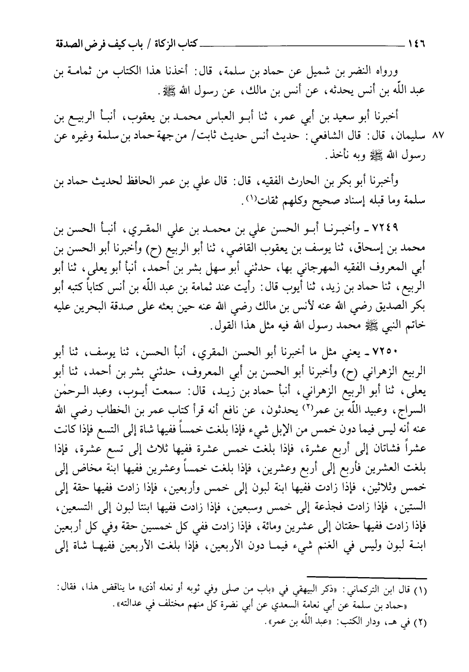 7250 - يَعْنِي مِثْلَ مَا أَخْبَرَنَا أَبُو الْحَسَنِ الْمُقْرِئُ، أنبأ الْحَسَنُ، ثنا يُوسُفُ، ثنا أَبُو الرَّبِيعِ الزَّهْرَانِيُّ، ح وَأَخْبَرَنَا أَبُو الْحَسَنِ بْنُ أَبِي الْمَعْرُوفِ، حَدَّثَنِي بِشْرُ بْنُ أَحْمَدَ، ثنا أَبُو يَعْلَى، ثنا أَبُو الرَّبِيعِ الزَّهْرَانِيُّ، أنبأ حَمَّادُ بْنُ زَيْدٍ، قَالَ: سَمِعْتُ أَيُّوبَ، وَعَبْدَ الرَّحْمَنِ السَّرَّاجَ، وَعُبَيْدَ اللهِ بْنَ عُمَرَ يُحَدِّثُونَ عَنْ نَافِعٍ، أَنَّهُ قَرَأَ كِتَابَ عُمَرَ بْنِ الْخَطَّابِ رَضِيَ اللهُ عَنْهُ أَنَّهُ: " §لَيْسَ فِيمَا دُونَ خَمْسٍ مِنَ الْإِبِلِ شَيْءٌ، فَإِذَا بَلَغَتْ خَمْسًا فَفِيهَا شَاةٌ إِلَى التِّسْعِ فَإِذَا كَانَتْ عَشْرًا فَشَاتَانِ إِلَى أَرْبَعَ عَشْرَةَ، فَإِذَا بَلَغَتْ خَمْسَ عَشْرَةَ فَفِيهَا ثَلَاثٌ إِلَى تِسْعَ عَشْرَةَ فَإِذَا بَلَغَتِ الْعِشْرِينَ فَأَرْبَعٌ إِلَى أَرْبَعٍ وَعِشْرِينَ، فَإِذَا بَلَغَتْ خَمْسًا وَعِشْرِينَ فَفِيهَا ابْنَةُ مَخَاضٍ إِلَى خَمْسٍ وَثَلَاثِينَ فَإِذَا زَادَتْ فَفِيهَا ابْنَةُ لَبُونٍ إِلَى خَمْسٍ وَأَرْبَعِينَ فَإِذَا زَادَتْ فَفِيهَا حِقَّةٌ إِلَى السِّتِّينَ فَإِذَا زَادَتْ فَجَذَعَةٌ إِلَى خَمْسٍ وَسَبْعِينَ، فَإِذَا زَادَتْ فَفِيهَا ابْنَتَا لَبُونٍ إِلَى التِّسْعِينَ فَإِذَا زَادَتْ فَفِيهَا حِقَّتَانِ إِلَى عِشْرِينَ وَمِائَةٍ، فَإِذَا زَادَتْ فَفِي كُلِّ خَمْسِينَ حِقَّةٌ وَفِي كُلِّ أَرْبَعِينَ ابْنَةُ لَبُونٍ وَلَيْسَ فِي الْغَنَمِ شَيْءٌ فِيمَا دُونَ الْأَرْبَعِينَ، فَإِذَا بَلَغَتِ الْأَرْبَعِينَ فَفِيهَا شَاةٌ إِلَى -[147]- عِشْرِينَ وَمِائَةٍ، فَإِذَا زَادَتْ فَشَاتَانِ إِلَى الْمِائَتَيْنِ فَإِذَا زَادَتْ عَلَى الْمِائَتَيْنِ فَثَلَاثٌ إِلَى ثَلَاثِ مِائَةٍ، فَإِذَا زَادَتْ عَلَى ثَلَاثِ مِائَةٍ فَفِي كُلِّ مِائَةٍ تَامَّةٍ شَاةٌ " وَرَوَاهُ الثَّوْرِيُّ، عَنْ عُبَيْدِ اللهِ بْنِ عُمَرَ، عَنْ نَافِعٍ، عَنِ ابْنِ عُمَرَ، عَنْ عُمَرَ. وَرَوَاهُ مُوسَى بْنُ عُقْبَةَ، عَنْ نَافِعٍ، عَنْ عَبْدِ اللهِ بْنِ عُمَرَ قَالَ: هَذِهِ نُسْخَةُ كِتَابِ عُمَرَ رَضِيَ اللهُ عَنْهُ