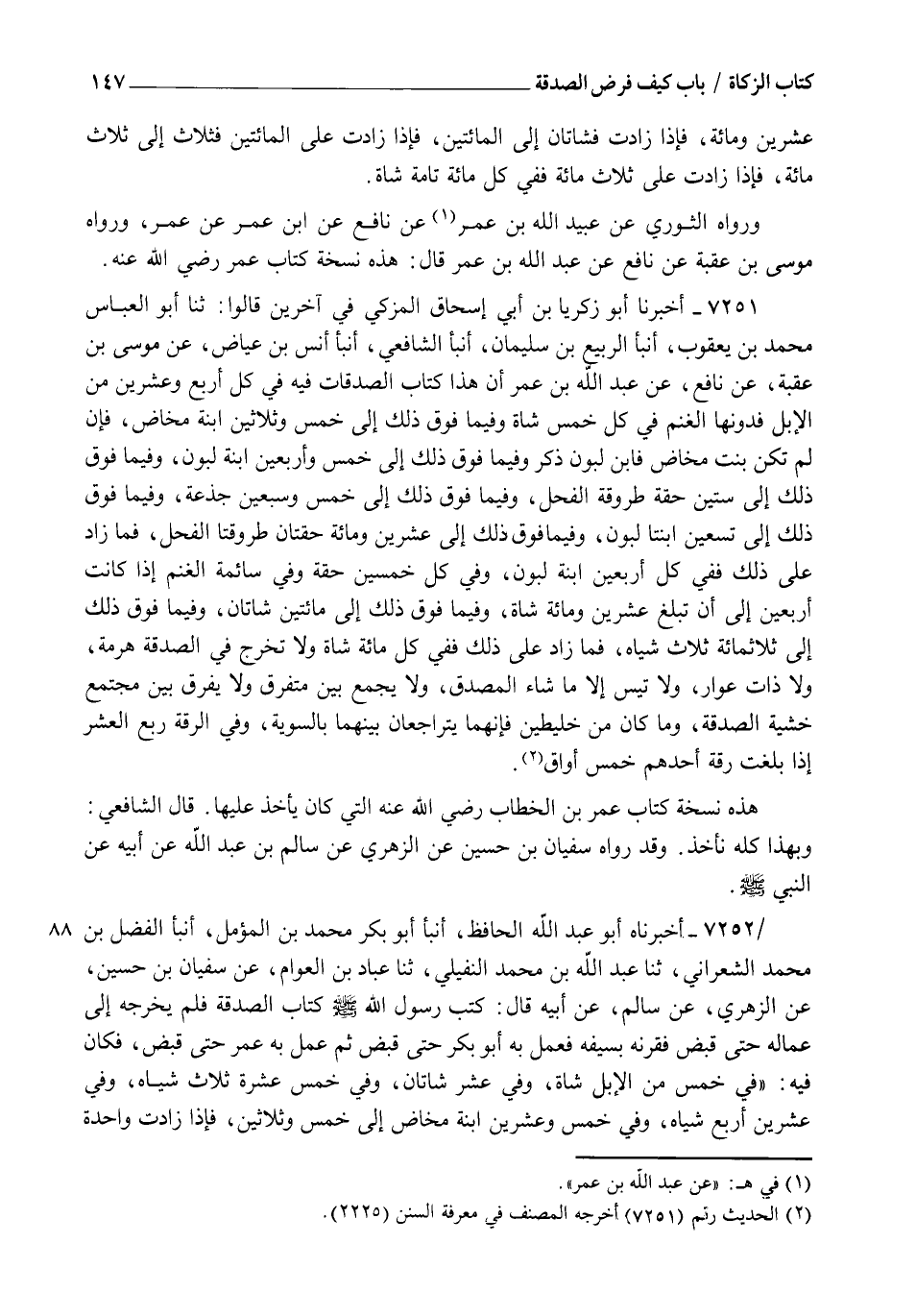 7251 - أَخْبَرَنَا أَبُو زَكَرِيَّا بْنُ أَبِي إِسْحَاقَ الْمُزَكِّي، فِي آخَرِينَ قَالُوا: ثنا أَبُو الْعَبَّاسِ مُحَمَّدُ بْنُ يَعْقُوبَ أنبأ الرَّبِيعُ بْنُ سُلَيْمَانَ، أنبأ الشَّافِعِيُّ، أنبأ أَنَسُ بْنُ عِيَاضٍ، عَنْ مُوسَى بْنِ عُقْبَةَ، عَنْ نَافِعٍ، عَنْ عَبْدِ اللهِ بْنِ عُمَرَ: " إِنَّ هَذَا §كِتَابُ الصَّدَقَاتِ فِيهِ فِي كُلِّ أَرْبَعٍ وَعِشْرِينَ مِنَ الْإِبِلِ فَدُونَهَا الْغَنَمُ فِي كُلِّ خَمْسٍ شَاةٌ وَفِيمَا فَوْقَ ذَلِكَ إِلَى خَمْسٍ وَثَلَاثِينَ ابْنَةُ مَخَاضٍ فَإِنْ لَمْ تَكُنْ بِنْتَ مَخَاضٍ فَابْنُ لَبُونٍ ذَكَرٌ، وَفِيمَا فَوْقَ ذَلِكَ إِلَى خَمْسٍ وَأَرْبَعِينَ ابْنَةُ لَبُونٍ، وَفِيمَا فَوْقَ ذَلِكَ إِلَى سِتِّينَ حِقَّةٌ طَرُوقَةُ الْفَحْلِ، وَفِيمَا فَوْقَ ذَلِكَ إِلَى خَمْسٍ وَسَبْعِينَ جَذَعَةٌ، وَفِيمَا فَوْقَ ذَلِكَ إِلَى تِسْعِينَ ابْنَتَا لَبُونٍ، وَفِيمَا فَوْقَ ذَلِكَ إِلَى عِشْرِينَ وَمِائَةٍ حِقَّتَانِ طَرُوقَتَا الْفَحْلِ فَمَا زَادَ عَلَى ذَلِكَ فَفِي كُلِّ أَرْبَعِينَ ابْنَةُ لَبُونٍ وَفِي كُلِّ خَمْسِينَ حِقَّةٌ وَفِي سَائِمَةِ الْغَنَمِ إِذَا كَانَتْ أَرْبَعِينَ إِلَى أَنْ تَبْلُغَ عِشْرِينَ وَمِائَةَ شَاةٍ، وَفِيمَا فَوْقَ ذَلِكَ إِلَى مِائَتَيْنِ شَاتَانِ، وَفِيمَا فَوْقَ ذَلِكَ إِلَى ثَلَاثِمِائَةٍ ثَلَاثُ شِيَاهٍ فَمَا زَادَ عَلَى ذَلِكَ فَفِي كُلِّ مِائَةٍ شَاةٌ، وَلَا تُخْرَجُ فِي الصَّدَقَةِ هَرِمَةٌ وَلَا ذَاتُ عَوَارٍ وَلَا تَيْسٌ إِلَّا مَا شَاءَ الْمُصَدِّقُ وَلَا يُجْمَعُ بَيْنَ مُتَفَرِّقٍ وَلَا يُفَرَّقُ بَيْنَ مُجْتَمِعٍ خَشْيَةَ الصَّدَقَةِ، وَمَا كَانَ مِنْ خَلِيطَيْنِ فَإِنَّهُمَا يَتَرَاجَعَانِ بَيْنَهُمَا بِالسَّوِيَّةِ، وَفِي الرِّقَةِ رُبْعُ الْعُشْرِ إِذَا بَلَغَتْ رِقَةُ أَحَدِهِمْ خَمْسَ أَوَاقٍ " هَذِهِ نُسْخَةُ كِتَابِ عُمَرَ بْنِ الْخَطَّابِ رَضِيَ اللهُ عَنْهُ الَّتِي كَانَ يَأْخُذُ عَلَيْهَا قَالَ الشَّافِعِيُّ: وَبِهَذَا كُلِّهِ نَأْخُذُ وَقَدْ رَوَاهُ سُفْيَانُ بْنُ حُسَيْنٍ عَنِ الزُّهْرِيِّ عَنْ سَالِمِ بْنِ عَبْدِ اللهِ عَنْ أَبِيهِ عَنِ النَّبِيِّ صَلَّى اللهُ عَلَيْهِ وَسَلَّمَ