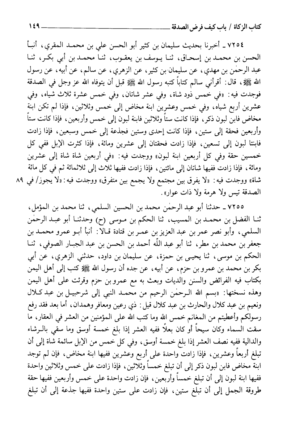 7254 - أَخْبَرَنَا بِحَدِيثِ سُلَيْمَانَ بْنِ كَثِيرٍ، أَبُو الْحَسَنِ عَلِيُّ بْنُ مُحَمَّدٍ الْمُقْرِئُ , أنبأ الْحَسَنُ بْنُ مُحَمَّدِ بْنِ إِسْحَاقَ، ثنا يُوسُفُ بْنُ يَعْقُوبَ، ثنا مُحَمَّدُ بْنُ أَبِي بَكْرٍ، ثنا عَبْدُ الرَّحْمَنِ بْنُ مَهْدِيٍّ، عَنْ سُلَيْمَانَ بْنِ كَثِيرٍ، عَنِ الزُّهْرِيِّ، عَنْ سَالِمٍ، عَنْ أَبِيهِ، عَنْ رَسُولِ اللهِ صَلَّى اللهُ عَلَيْهِ وَسَلَّمَ قَالَ: أَقْرَأَنِي سَالِمٌ كِتَابًا كَتَبَهُ رَسُولُ اللهِ صَلَّى اللهُ عَلَيْهِ وَسَلَّمَ قَبْلَ أَنْ يَتَوَفَّاهُ اللهُ عَزَّ وَجَلَّ فِي الصَّدَقَةِ فَوَجَدْتُ فِيهِ: §" فِي خَمْسِ ذَوْدٍ شَاةٌ وَفِي عَشْرٍ شَاتَانِ وَفِي خَمْسَ عَشْرَةَ ثَلَاثُ شِيَاهٍ وَفِي عِشْرِينَ أَرْبَعُ شِيَاهٍ وَفِي خَمْسٍ وَعِشْرِينَ ابْنَةُ مَخَاضٍ إِلَى خَمْسٍ وَثَلَاثِينَ فَإِذَا لَمْ تَكُنِ ابْنَةَ مَخَاضٍ فَابْنُ لَبُونٍ ذَكَرٌ، فَإِذَا كَانَتْ سِتًّا وَثَلَاثِينَ فَابْنَةُ لَبُونٍ إِلَى خَمْسٍ وَأَرْبَعِينَ، فَإِذَا كَانَتْ سِتًّا وَأَرْبَعِينَ فَحِقَّةٌ إِلَى سِتِّينَ فَإِذَا كَانَتْ إِحْدَى وَسِتِّينَ فَجَذَعَةٌ إِلَى خَمْسٍ وَسَبْعِينَ فَإِذَا زَادَتْ فَابْنَتَا لَبُونٍ إِلَى تِسْعِينَ، فَإِذَا زَادَتْ فَحِقَّتَانِ إِلَى عِشْرِينَ وَمِائَةٍ، فَإِذَا كَثُرَتِ الْإِبِلُ فَفِي كُلِّ خَمْسِينَ حِقَّةٌ وَفِي كُلِّ أَرْبَعِينَ ابْنَةُ لَبُونٍ وَوَجَدْتُ فِيهِ فِي أَرْبَعِينَ شَاةً شَاةٌ إِلَى عِشْرِينَ وَمِائَةٍ، فَإِذَا زَادَتْ فَفِيهَا شَاتَانِ إِلَى مِائَتَيْنِ فَإِذَا زَادَتْ فَفِيهَا ثَلَاثٌ إِلَى ثَلَاثِمِائَةٍ ثُمَّ فِي كُلِّ مِائَةٍ شَاةٌ، وَوَجَدْتُ فِيهِ لَا يُفَرَّقُ بَيْنَ مُجْتَمِعٍ وَلَا يُجْمَعُ بَيْنَ مُتَفَرِّقٍ، وَوَجَدْتُ فِيهِ لَا يَجُوزُ فِي الصَّدَقَةِ تَيْسٌ وَلَا هَرِمَةٌ وَلَا ذَاتُ عَوَارٍ "