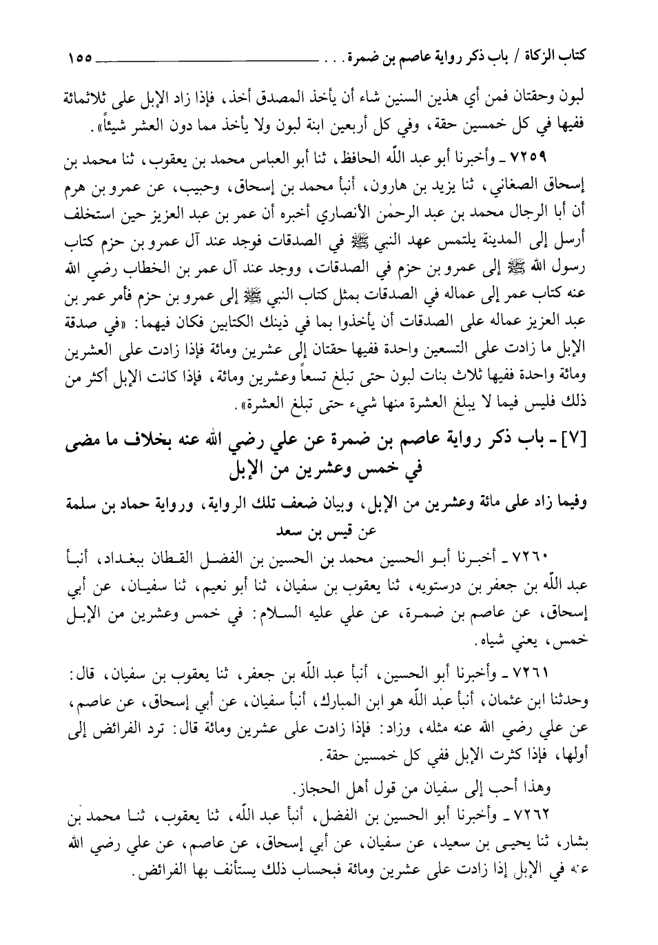 7262 - وَأَخْبَرَنَا أَبُو الْحُسَيْنِ بْنُ الْفَضْلِ، أنبأ عَبْدُ اللهِ، ثنا يَعْقُوبُ، ثنا مُحَمَّدُ بْنُ بَشَّارٍ، ثنا يَحْيَى بْنُ سَعِيدٍ، عَنْ سُفْيَانَ، عَنْ أَبِي إِسْحَاقَ، عَنْ عَاصِمٍ، عَنْ عَلِيٍّ، رَضِيَ اللهُ عَنْهُ §" فِي الْإِبِلِ إِذَا زَادَتْ عَلَى عِشْرِينَ وَمِائَةٍ فَبِحِسَابِ ذَلِكَ يُسْتَأْنَفُ بِهَا الْفَرَائِضُ " -[156]- وَعَنْ سُفْيَانَ عَنْ مَنْصُورٍ عَنْ إِبْرَاهِيمَ مِثْلُ ذَلِكَ قَالَ أَبُو يُوسُفَ يَعْنِي يَعْقُوبَ بْنَ سُفْيَانَ: بَلَغَنِي عَنْ يَحْيَى بْنِ مَعِينٍ قَالَ: كَانَ يَحْيَى بْنُ سَعِيدٍ يُحَدِّثُ بِحَدِيثٍ يُغَلِّطُ فِيهِ عَنْ سُفْيَانَ الثَّوْرِيِّ عَنْ أَبِي إِسْحَاقَ عَنْ عَاصِمٍ عَنْ عَلِيٍّ رَضِيَ اللهُ عَنْهُ قَالَ: إِذَا زَادَتِ الْإِبِلُ عَلَى عِشْرِينَ وَمِائَةٍ تُسْتَأْنَفُ الْفَرِيضَةُ. وَيَحْيَى بْنُ سَعِيدٍ لَمْ يُغَلِّطْ فِي هَذَا وَقَدْ تَابَعَهُ ابْنُ الْمُبَارَكِ وَهَذَا مَشْهُورٌ مِنْ رِوَايَةِ سُفْيَانَ عَنْ أَبِي إِسْحَاقَ عَنْ عَاصِمٍ عَنْ عَلِيٍّ وَقَدْ أَنْكَرَ أَهْلُ الْعِلْمِ هَذَا عَلَى عَاصِمِ بْنِ ضَمْرَةَ لِأَنَّ رِوَايَةَ عَاصِمِ بْنِ ضَمْرَةَ عَنْ عَلِيٍّ عَلَيْهِ السَّلَامُ خِلَافُ كِتَابِ آلِ عَمْرِو بْنِ حَزْمٍ وَخِلَافُ كِتَابِ أَبِي بَكْرٍ وَعُمَرَ رَضِيَ اللهُ عَنْهُمَا قَالَ الشَّيْخُ: أَمَّا أَبُو زَكَرِيَّا يَحْيَى بْنُ مَعِينٍ رَحِمَهُ اللهُ فَإِنَّهُ أَحَالَ بِالْغَلَطِ عَلَى يَحْيَى بْنِ سَعِيدٍ وَذَلِكَ فِيمَا