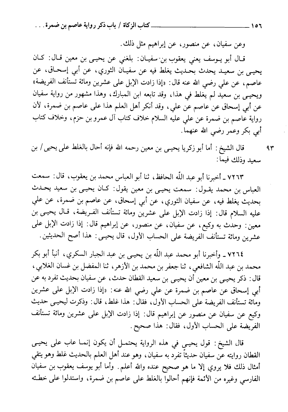 7263 - أَخْبَرَنَا أَبُو عَبْدِ اللهِ الَحَافِظُ، ثنا أَبُو الْعَبَّاسِ مُحَمَّدُ بْنُ يَعْقُوبَ قَالَ: سَمِعْتُ الْعَبَّاسَ بْنَ مُحَمَّدٍ، يَقُولُ: سَمِعْتُ يَحْيَى بْنَ مَعِينٍ يَقُولُ: كَانَ يَحْيَى بْنُ سَعِيدٍ يُحَدِّثُ بِحَدِيثٍ يُغَلِّطُ فِيهِ عَنْ سُفْيَانَ الثَّوْرِيِّ، عَنْ أَبِي إِسْحَاقَ، عَنْ عَاصِمِ بْنِ ضَمْرَةَ، عَنْ عَلِيٍّ عَلَيْهِ السَّلَامُ قَالَ: §" إِذَا زَادَتِ الْإِبِلُ عَلَى عِشْرِينَ وَمِائَةٍ تُسْتَأْنَفُ الْفَرِيضَةُ " قَالَ يَحْيَى بْنُ مَعِينٍ: وَحَدَّثَ بِهِ وَكِيعٌ عَنْ سُفْيَانَ عَنْ مَنْصُورٍ عَنْ إِبْرَاهِيمَ قَالَ: إِذَا زَادَتِ الْإِبِلُ عَلَى عِشْرِينَ وَمِائَةٍ تُسْتَأْنَفُ الْفَرِيضَةُ عَلَى الْحِسَابِ الْأَوَّلِ. قَالَ يَحْيَى: هَذَا أَصَحُّ الْحَدِيثَيْنِ