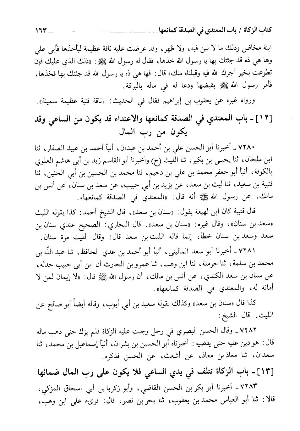 7280 - أَخْبَرَنَا أَبُو الْحَسَنِ عَلِيُّ بْنُ أَحْمَدَ بْنِ عَبْدَانَ , أنبأ أَحْمَدُ بْنُ عُبَيْدٍ الصَّفَّارُ، ثنا ابْنُ مِلْحَانَ، ثنا يَحْيَى بْنُ بُكَيْرٍ، ثنا اللَّيْثُ، ح وَأَخْبَرَنَا أَبُو الْقَاسِمِ زَيْدُ بْنُ أَبِي هَاشِمٍ الْعَلَوِيُّ بِالْكُوفَةِ , أنبأ أَبُو جَعْفَرٍ مُحَمَّدُ بْنُ عَلِيِّ بْنِ دُحَيْمٍ , ثنا مُحَمَّدُ بْنُ الْحُسَيْنِ بْنِ أَبِي الْحُنَيْنِ، ثنا قُتَيْبَةُ بْنُ سَعِيدٍ، ثنا لَيْثُ بْنُ سَعْدٍ، عَنْ يَزِيدَ بْنِ أَبِي حَبِيبٍ، عَنْ سَعْدِ بْنِ سِنَانٍ، عَنْ أَنَسِ بْنِ مَالِكٍ، عَنْ رَسُولِ اللهِ صَلَّى اللهُ عَلَيْهِ وَسَلَّمَ أَنَّهُ قَالَ: " §الْمُعْتَدِي فِي الصَّدَقَةِ كَمَانِعِهَا " قَالَ قُتَيْبَةُ: كَانَ ابْنُ لَهِيعَةَ يَقُولُ: سِنَانُ بْنُ سَعْدٍ قَالَ الشَّيْخُ أَحْمَدُ: كَذَا يَقُولُهُ اللَّيْثُ سَعْدُ بْنُ سِنَانٍ , وَقَالَ غَيْرُهُ سِنَانُ بْنُ سَعْدٍ، قَالَ الْبُخَارِيُّ: الصَّحِيحُ عِنْدِي سِنَانُ بْنُ سَعْدٍ وَسَعْدُ بْنُ سِنَانٍ خَطَأٌ , إِنَّمَا قَالَهُ اللَّيْثُ بْنُ سَعْدٍ قَالَ: وَقَالَ اللَّيْثُ مَرَّةً سِنَانٌ