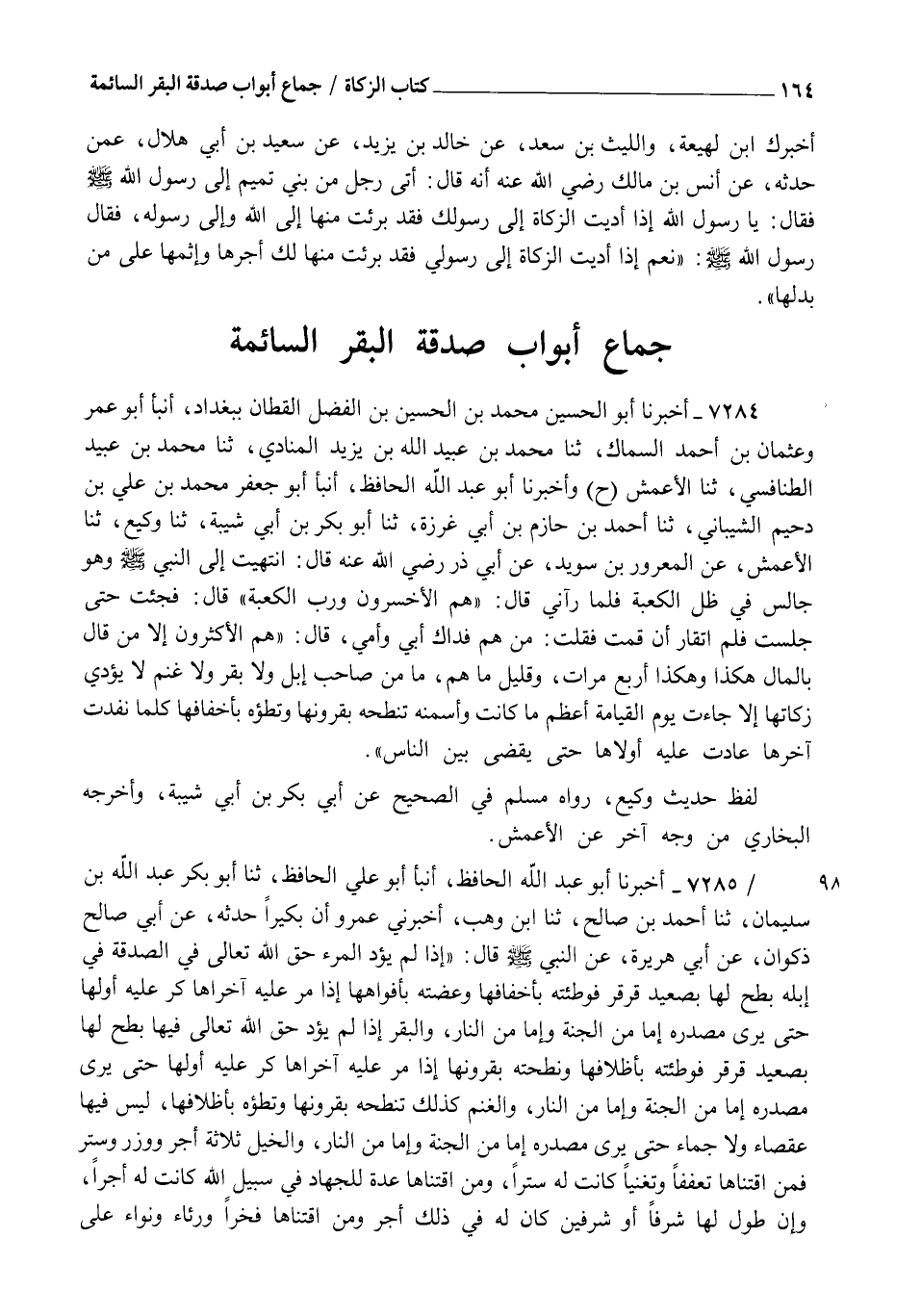 7284 - أَخْبَرَنَا أَبُو الْحُسَيْنِ مُحَمَّدُ بْنُ الْحُسَيْنِ بْنِ الْفَضْلِ الْقَطَّانُ بِبَغْدَادَ , أنبأ أَبُو عُمَرَ وَعُثْمَانُ بْنُ أَحْمَدَ بْنِ السَّمَّاكِ، ثنا مُحَمَّدُ بْنُ عُبَيْدِ اللهِ بْنِ يَزِيدَ الْمُنَادِي، ثنا مُحَمَّدُ بْنُ عُبَيْدٍ الطَّنَافِسِيُّ، ثنا الْأَعْمَشُ، ح وَأَخْبَرَنَا أَبُو عَبْدِ اللهِ الَحَافِظُ، أنبأ أَبُو جَعْفَرٍ مُحَمَّدُ بْنُ عَلِيِّ بْنُ دُحَيْمٍ الشَّيْبَانِيُّ ثنا أَحْمَدُ بْنُ حَازِمِ بْنِ أَبِي غَرَزَةَ، ثنا أَبُو بَكْرِ بْنُ أَبِي شَيْبَةَ، ثنا وَكِيعٌ، ثنا الْأَعْمَشُ، عَنِ الْمَعْرُورِ بْنِ سُوَيْدٍ، عَنْ أَبِي ذَرٍّ، رَضِيَ اللهُ عَنْهُ قَالَ: انْتَهَيْتُ إِلَى النَّبِيِّ صَلَّى اللهُ عَلَيْهِ وَسَلَّمَ وَهُوَ جَالِسٌ فِي ظِلِّ الْكَعْبَةِ فَلَمَّا رَآنِي قَالَ: §" هُمُ الْأَخْسَرُونَ وَرَبِّ الْكَعْبَةِ ". قَالَ فَجِئْتُ حَتَّى جَلَسْتُ فَلَمْ أَتَقَارَّ أَنْ قُمْتُ فَقُلْتُ مَنْ هُمْ؟ فِدَاكَ أَبِي وَأُمِّي , قَالَ: " هُمُ الْأَكْثَرُونَ إِلَّا مَنْ قَالَ بِالْمَالِ هَكَذَا وَهَكَذَا أَرْبَعَ مَرَّاتٍ، وَقَلِيلٌ مَا هُمْ مَا مِنْ صَاحِبِ إِبِلٍ وَلَا بَقَرٍ وَلَا غَنَمٍ لَا يُؤَدِّي زَكَاتَهَا إِلَّا جَاءَتْ يَوْمَ الْقِيَامَةِ أَعْظَمَ مَا كَانَتْ وَأَسْمَنَهُ تَنْطَحُهُ بِقُرُونِهَا وَتَطَؤُهُ بِأَخْفَافِهَا , كُلَّمَا نَفَذَتْ أُخْرَهَا عَادَتْ عَلَيْهِ أُولَاهَا حَتَّى يُقْضَى بَيْنَ النَّاسِ ". لَفْظُ حَدِيثِ وَكِيعٍ رَوَاهُ مُسْلِمٌ فِي الصَّحِيحِ عَنْ أَبِي بَكْرِ بْنِ أَبِي شَيْبَةَ وَأَخْرَجَهُ الْبُخَارِيُّ مِنْ وَجْهٍ آخَرَ عَنِ الْأَعْمَشِ