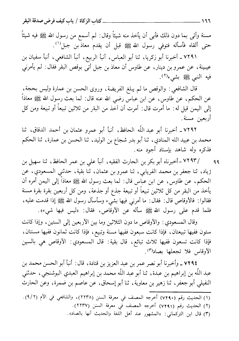 7293 - أَخْبَرَنَاهُ أَبُو بَكْرِ بْنُ الْحَارِثِ الْفَقِيهُ، أنبأ عَلِيُّ بْنُ عُمَرَ الْحَافِظُ، ثنا سَهْلُ بْنُ زِيَادٍ، ثنا جَعْفَرُ بْنُ مُحَمَّدٍ الْفِرْيَابِيُّ، ثنا عَمْرُو بْنُ عُثْمَانَ، ثنا بَقِيَّةُ، حَدَّثَنِي الْمَسْعُودِيُّ، عَنِ الْحَكَمِ، عَنْ طَاوُسٍ، عَنِ ابْنِ عَبَّاسٍ قَالَ: لَمَّا بَعَثَ رَسُولُ اللهِ صَلَّى اللهُ عَلَيْهِ وَسَلَّمَ مُعَاذًا إِلَى الْيَمَنِ أَمَرَهُ أَنْ يَأْخُذَ مِنَ الْبَقَرِ مِنْ كُلِّ ثَلَاثِينَ تَبِيعًا أَوْ تَبِيعَةً جَذَعًا أَوْ جَذَعَةً وَمِنْ كُلِّ أَرْبَعِينَ بَقَرَةً بَقَرَةً مُسِنَّةً فَقَالُوا فَالْأَوْقَاصُ؟ قَالَ: فَقَالَ: مَا أَمَرَنِي فِيهَا بِشَيْءٍ وَسَأَسْأَلُ رَسُولَ اللهِ صَلَّى اللهُ عَلَيْهِ وَسَلَّمَ إِذَا قَدِمْتُ عَلَيْهِ فَلَمَّا قَدِمَ عَلَى رَسُولِ اللهِ صَلَّى اللهُ عَلَيْهِ وَسَلَّمَ سَأَلَهُ عَنِ الْأَوْقَاصِ فَقَالَ: " §لَيْسَ فِيهَا شَيْءٌ " وَقَالَ الْمَسْعُودِيُّ: وَالْأَوْقَاصُ مَا دُونَ الثَّلَاثِينَ وَمَا بَيْنَ الْأَرْبَعِينَ إِلَى السِّتِّينَ، وَإِذَا كَانَتْ سِتُّونَ فَفِيهَا تَبِيعَتَانِ، فَإِذَا كَانَتْ سَبْعُونَ فَفِيهَا مُسِنَّةٌ وَتَبِيعٌ، فَإِذَا كَانَتْ ثَمَانُونَ فَفِيهَا مُسِنَّتَانِ، فَإِذَا كَانَتْ تِسْعُونَ فَفِيهَا ثَلَاثُ تَبَائِعَ، قَالَ بَقِيَّةُ: قَالَ الْمَسْعُودِيُّ الْأَوْقَاصُ: هِيَ بِالسِّينِ الْأَوْقَاسُ فَلَا تَجْعَلْهَا بِصَادٍ