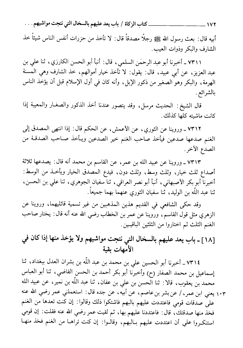 7312 - وَرُوِّينَا عَنِ الثَّوْرِيِّ، عَنِ الْأَعْمَشِ، عَنِ الْحَكَمِ قَالَ: §" إِذَا انْتَهَى الْمُصَدِّقُ إِلَى الْغَنَمِ صَدَعَهَا صَدْعَيْنِ فَيَأْخُذُ صَاحِبُ الْغَنَمِ خَيْرَ الصَّدْعَيْنِ وَيَأْخُذُ صَاحِبُ الصَّدَقَةِ مِنَ الصَّدْعِ الْآخَرِ "