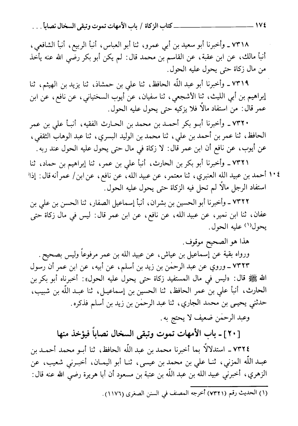 7322 - وَأَخْبَرَنَا أَبُو الْحُسَيْنِ بْنُ بِشْرَانَ، أنبأ إِسْمَاعِيلُ الصَّفَّارُ، ثنا الْحَسَنُ بْنُ عَلِيِّ بْنِ عَفَّانَ، ثنا ابْنُ نُمَيْرٍ، عَنْ عُبَيْدِ اللهِ، عَنْ نَافِعٍ، عَنِ ابْنِ عُمَرَ قَالَ: §" لَيْسَ فِي مَالٍ زَكَاةٌ حَتَّى يَحُولَ عَلَيْهِ الْحَوْلُ " هَذَا هُوَ الصَّحِيحُ مَوْقُوفٌ، وَرَوَاهُ بَقِيَّةُ عَنْ إِسْمَاعِيلَ بْنِ عَيَّاشٍ عَنْ عُبَيْدِ اللهِ بْنِ عُمَرَ مَرْفُوعًا وَلَيْسَ بِصَحِيحٍ