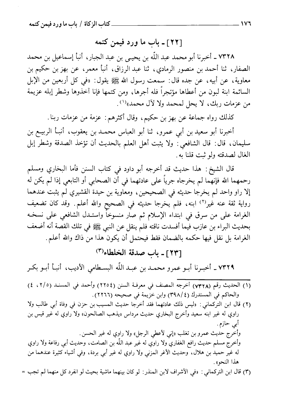 7328 - أَخْبَرَنَا أَبُو مُحَمَّدٍ عَبْدُ اللهِ بْنُ يَحْيَى بْنِ عَبْدِ الْجَبَّارِ، أنبأ إِسْمَاعِيلُ بْنُ مُحَمَّدٍ الصَّفَّارُ، ثنا أَحْمَدُ بْنُ مَنْصُورٍ الرَّمَادِيُّ، ثنا عَبْدُ الرَّزَّاقِ، أنبأ مَعْمَرٌ، عَنْ بَهْزِ بْنِ حَكِيمِ بْنِ مُعَاوِيَةَ، عَنْ أَبِيهِ، عَنْ جَدِّهِ، قَالَ: سَمِعْتُ رَسُولَ اللهِ صَلَّى اللهُ عَلَيْهِ وَسَلَّمَ يَقُولُ: §" فِي كُلِّ أَرْبَعِينَ مِنَ الْإِبِلِ السَّائِمَةِ ابْنَةُ لَبُونٍ , مَنْ أَعْطَاهَا مُؤْتَجِرًا فَلَهُ أَجْرُهَا وَمَنْ كَتَمَهَا فَإِنَّا آخِذُوهَا وَشَطْرَ إِبِلِهِ عَزِيمَةً مِنْ عَزَمَاتِ رَبِّكَ , لَا يَحِلُّ لِمُحَمَّدٍ وَلَا لِآلِ مُحَمَّدٍ " كَذَلِكَ رَوَاهُ جَمَاعَةٌ عَنْ بَهْزِ بْنِ حَكِيمٍ وَقَالَ أَكْثَرُهُمْ: عَزْمَةٌ مِنْ عَزَمَاتِ رَبِّنَا. أَخْبَرَنَا أَبُو سَعِيدِ بْنُ أَبِي عَمْرٍو، ثنا أَبُو الْعَبَّاسِ مُحَمَّدُ بْنُ يَعْقُوبَ أَنْبَأَ الرَّبِيعُ بْنُ سُلَيْمَانَ , قَالَ: قَالَ الشَّافِعِيُّ: وَلَا يُثْبِتُ أَهْلُ الْعِلْمِ بِالْحَدِيثِ أَنْ تُؤْخَذَ الصَّدَقَةُ وَشَطْرُ إِبِلِ الْغَالِّ لِصَدَقَتِهِ وَلَوْ ثَبَتَ قُلْنَا بِهِ. قَالَ الشَّيْخُ: هَذَا حَدِيثٌ قَدْ أَخْرَجَهُ أَبُو دَاوُدَ فِي كِتَابِ السُّنَنِ، فَأَمَّا الْبُخَارِيُّ وَمُسْلِمٌ رَحِمَهُمَا اللهُ فَإِنَّهُمَا لَمْ يُخْرِجَاهُ جَرْيًا عَلَى عَادَتِهِمَا فِي أَنَّ الصَّحَابِيَّ أَوِ التَّابِعِيَّ إِذَا لَمْ يَكُنْ لَهُ إِلَّا رَاوٍ وَاحِدٌ لَمْ يُخْرِجَا حَدِيثَهَ فِي الصَّحِيحَيْنِ , وَمُعَاوِيَةُ بْنُ حَيْدَةَ الْقُشَيْرِيُّ لَمْ يَثْبُتْ عِنْدَهُمَا رِوَايَةٌ ثِقَةٌ عَنْهُ غَيْرُ ابْنِهِ فَلَمْ يُخَرِّجَا حَدِيثَهُ فِي الصَّحِيحِ وَاللهُ أَعْلَمُ. وَقَدْ كَانَ تَضْعِيفُ الْغَرَامَةِ عَلَى مَنْ سَرَقَ فِي ابْتِدَاءِ الِاسْلَامِ ثُمَّ صَارَ مَنْسُوخًا، وَاسْتَدَلَّ الشَّافِعِيُّ عَلَى نَسْخِهِ بِحَدِيثِ الْبَرَاءِ بْنِ عَازِبٍ فِيمَا أَفْسَدَتْ نَاقَتُهُ فَلَمْ يُنْقَلْ عَنِ النَّبِيِّ صَلَّى اللهُ عَلَيْهِ وَسَلَّمَ فِي تِلْكَ الْقِصَّةِ أَنَّهُ أَضْعَفَ الْغَرَامَةَ بَلْ نَقَلَ فِيهَا حُكْمَهُ بِالضَّمَانِ فَقَطْ , فَيُحْتَمَلَ أَنْ يَكُونَ هَذَا مِنْ ذَاكَ وَاللهُ أَعْلَمُ