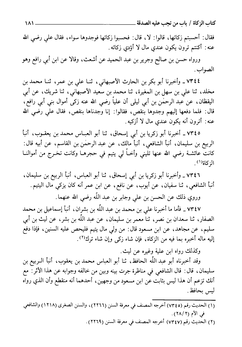 7346 - وَأَخْبَرَنَا أَبُو زَكَرِيَّا بْنُ أَبِي إِسْحَاقَ، ثنا أَبُو الْعَبَّاسِ، أنبأ الرَّبِيعُ بْنُ سُلَيْمَانَ، أنبأ الشَّافِعِيُّ، ثنا سُفْيَانُ، عَنْ أَيُّوبَ، عَنْ نَافِعٍ، عَنِ ابْنِ عُمَرَ أَنَّهُ كَانَ §يُزَكِّي مَالَ الْيَتِيمِ. وَرُوِيَ ذَلِكَ عَنِ الْحَسَنِ بْنِ عَلِيٍّ، وَجَابِرِ بْنِ عَبْدِ اللهِ رَضِيَ اللهُ عَنْهُمَا